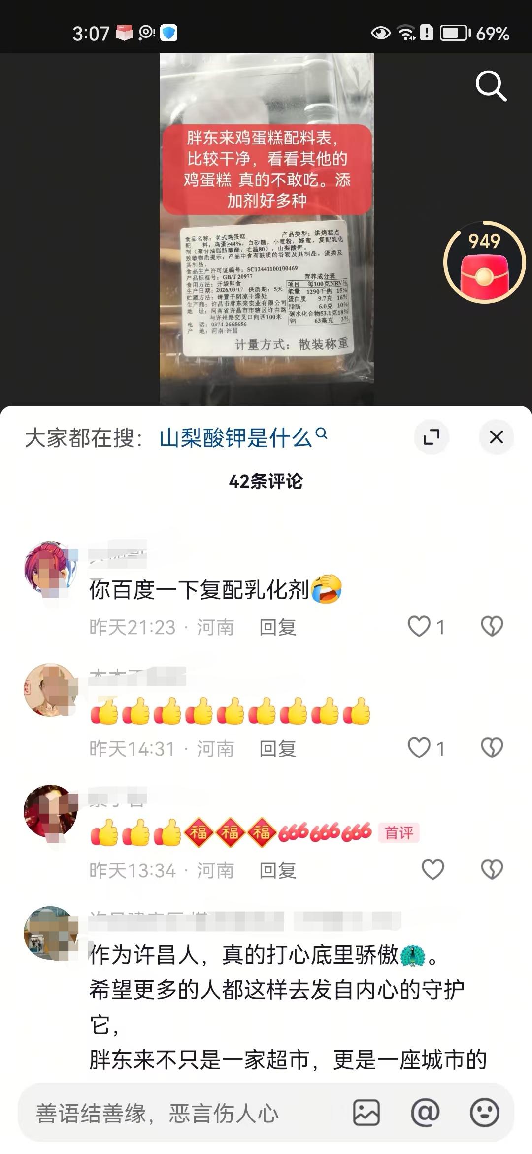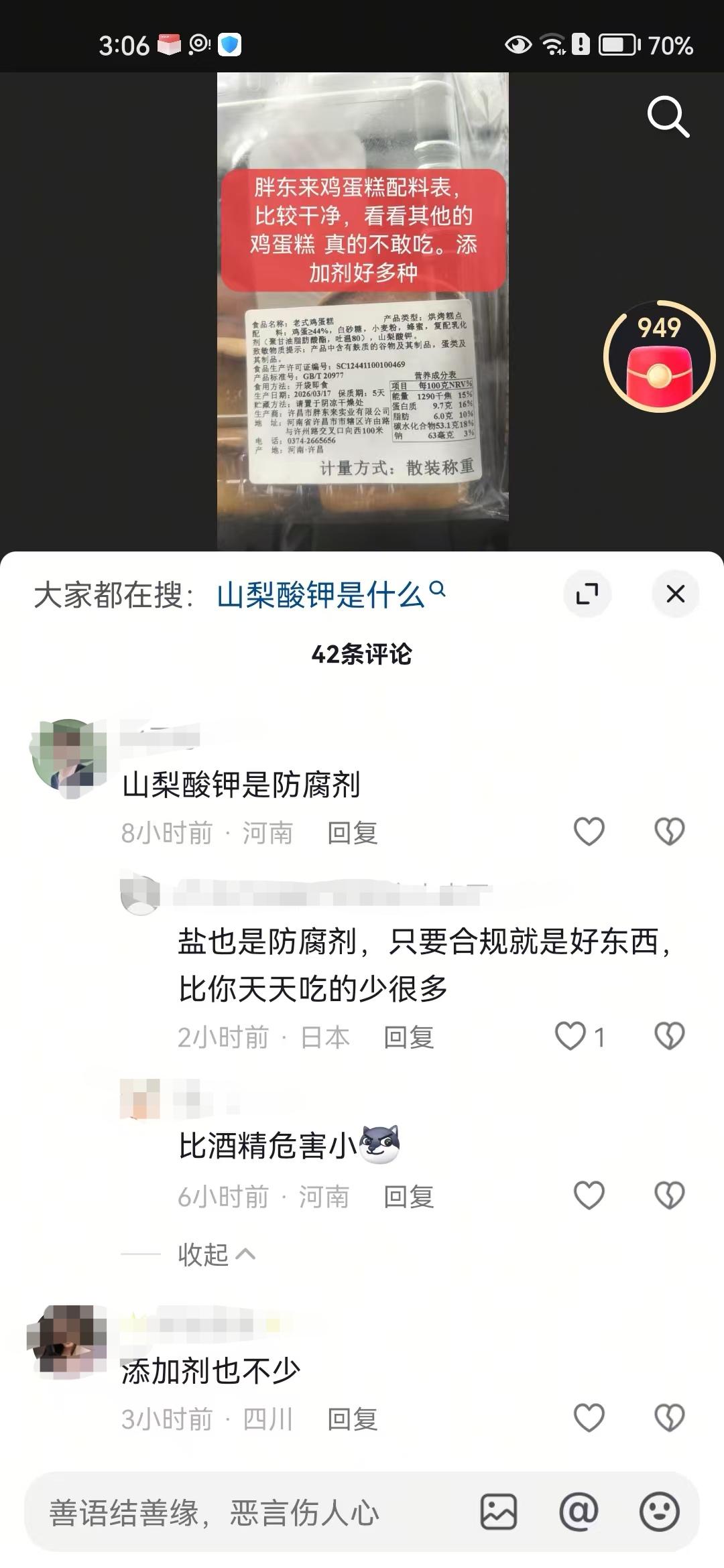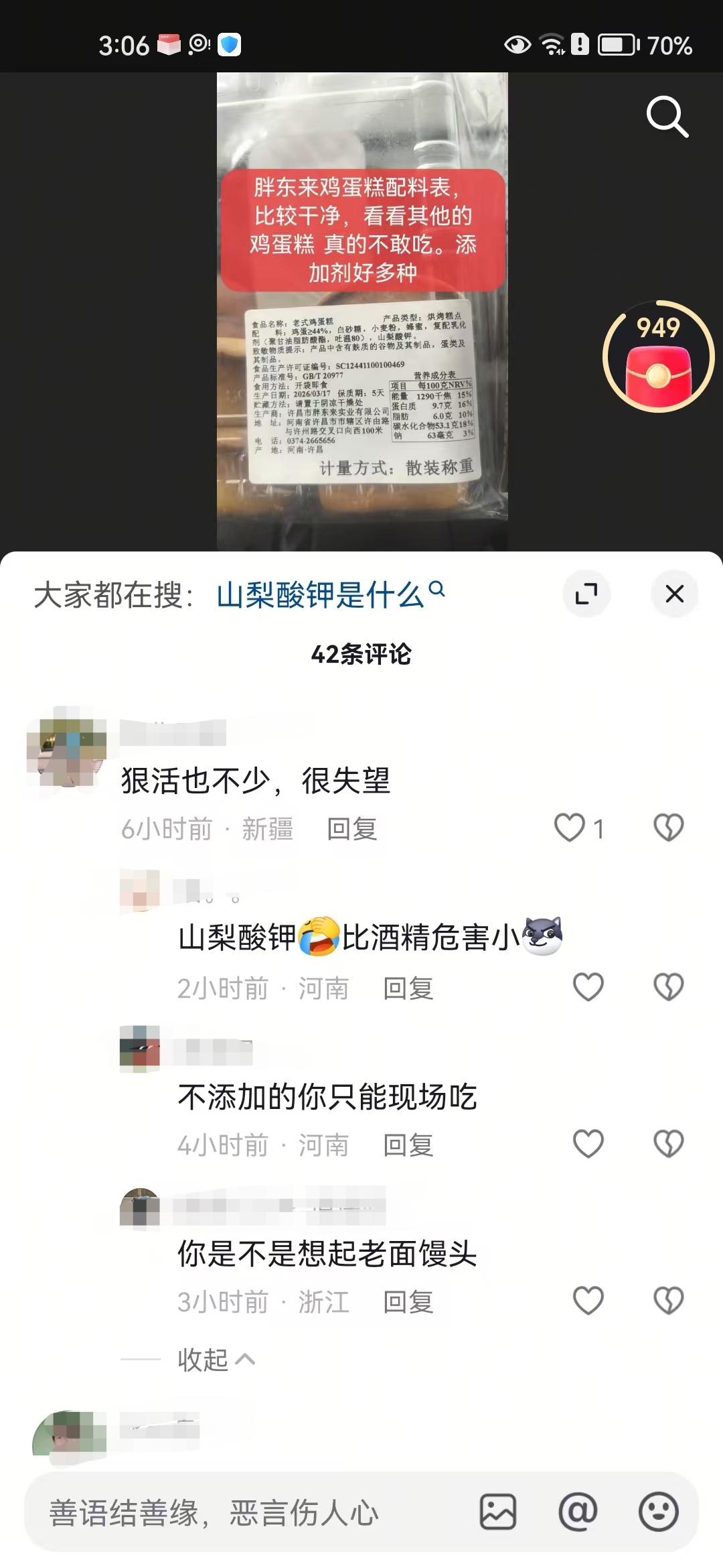 胖东来粉丝说胖东来的鸡蛋糕配料表非常干净,还说其他的鸡蛋糕添加剂过多,不敢吃,结果一看胖东来的鸡蛋糕添加剂也不少。 经常在网上看到胖东来粉丝说,胖东来产品没有科技与狠活,很少放添加剂,有人说胖东来的产品不好吃,他们就会回答说,科技与狠活吃多了,吃点真东西就不习惯了。 然后刷到了一个粉丝说,胖东来鸡蛋糕配料表干净,其他的鸡蛋糕添加剂太多,根本就不敢吃。 然而通过他放的胖东来鸡蛋糕配料表,也可以看到放了有3种添加剂,有网友评论说山梨酸钾就是防腐剂,胖东来粉丝解释说,这是添加剂中最温和的一种,比酒精危害还少。