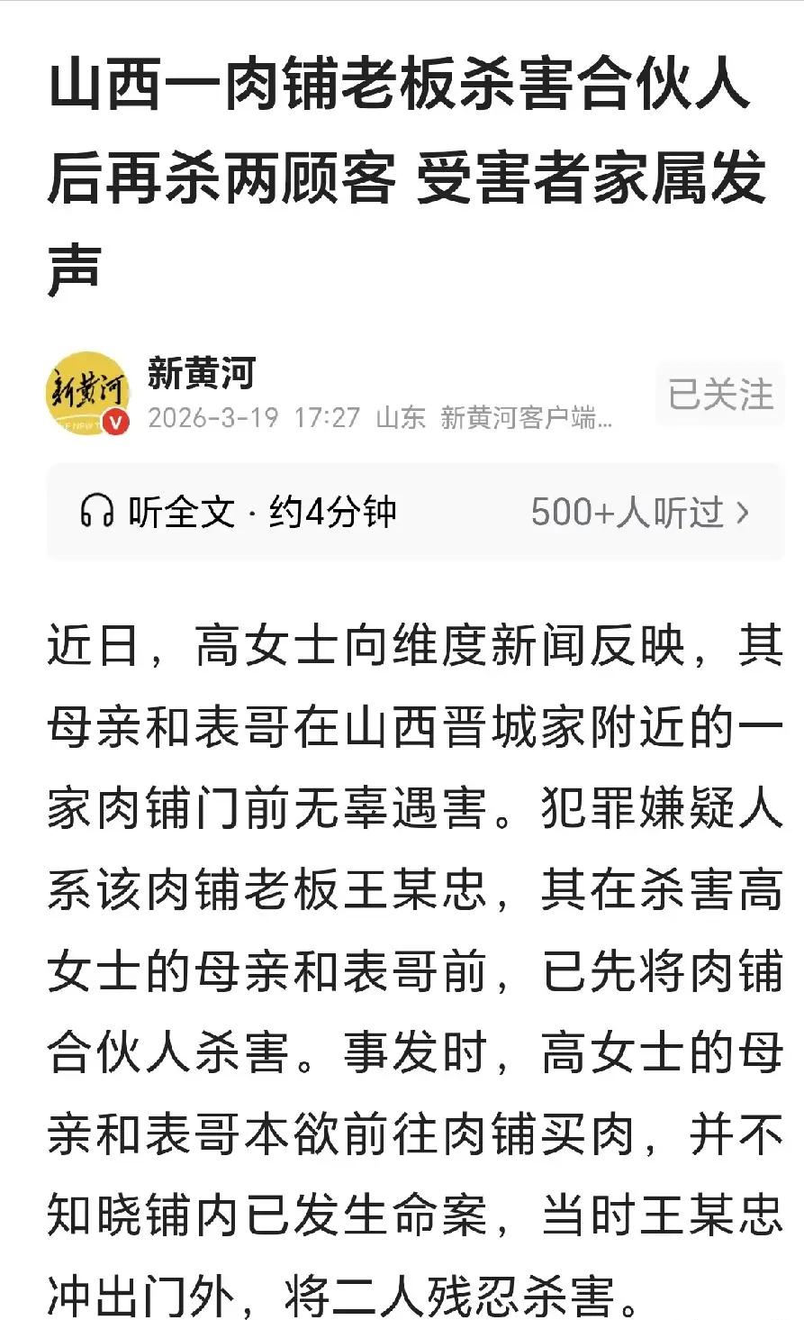 “太可怕了!”山西晋城,一男子开肉铺,合伙人妻子患了癌症,因为要照顾妻子,合伙人想退出店铺,可男子女儿要结婚,他也忙碌,不同意合伙人退出店铺,可是等他忙完,他又要求合伙人退出,合伙人不同意了,给妻子看病,已经花完了积蓄,他要继续留下经营店铺,男子急了,拿了把刀把合伙人杀死,这时,肉铺进来一男一女两位客户,男子冲出肉铺,一刀将男客户杀死,又噗噗几刀,将女客户杀死,家属赶来,悲痛欲绝,我们与他无冤无仇,不知他为何下此毒手? 山西晋城一家开了二十多年的老肉铺,本该是邻里日常买肉的寻常去处,却在一场失控的暴戾中,变成了吞噬三条人命的修罗场。 肉铺老板王某忠与李某生合伙经营多年,平日里分摊租金、轮流看店,收益归当日值守的人,相处一直还算和睦,靠着这间小店撑起了两个家庭的生计。 变故发生在2025年,李某生的妻子确诊甲状腺癌,重病缠身需要专人贴身照料,家里的积蓄也因为治病渐渐掏空,李某生无奈之下,提出退出肉铺经营,专心照顾病重的妻子。 彼时的王某忠,正赶上女儿结婚的大事,家里装修、操办婚事忙得焦头烂额,根本无力独自撑起肉铺的生意,当即拒绝了李某生的退伙请求。 本以为这场退伙风波会暂时搁置,可等到王某忠忙完女儿的婚事,回到肉铺后态度却彻底反转,反倒强硬要求李某生彻底退出店铺。 一边是妻子的救命钱没了着落,肉铺是唯一的经济来源,李某生说什么也不肯再退让;一边是王某忠执意要独自经营,双方多次争执不下,日积月累的怨气,慢慢变成了无法化解的死结。 案发当天的肉铺,还透着寻常的烟火气息。 李某生的妻子心疼丈夫操劳,特意做了他爱吃的饭菜送到店里,临走前还听邻居提及王某忠拿着刀来回踱步,她只当是肉铺日常切肉备货,丝毫没察觉到暗处涌动的杀机,这一别,竟是夫妻二人的最后一面。 妻子离开后,积压已久的矛盾彻底爆发,王某忠被怨气冲昏了头脑,拿起店内的屠刀,对着昔日并肩谋生的合伙人狠下杀手。 二十多年的合伙情分,在冰冷的刀刃面前碎得彻底,李某生倒在了自己坚守多年的肉铺里,再也没能醒来。 如果说杀害合伙人是矛盾激化的恶果,那接下来的行径,才真正让人见识到人性的恶能有多彻底。 杀红了眼的王某忠,彻底丧失了理智,恰好此时,一男一女两位顾客推门而入,他们只是偶遇后相约来买块肉,和凶手素不相识、无冤无仇,甚至没来得及说一句话。 王某忠没有丝毫犹豫,径直冲出肉铺,一刀就将男性顾客捅倒在地,紧接着又绕到另一侧,对着女性顾客的腹部连刺数刀。 鲜血瞬间染红了肉铺门前的地面,两个无辜的路人,就这样成了极端情绪的牺牲品,最终因失血过多不幸离世。 据警方权威通报,两名遇害顾客为母子关系,男性受害者是家中独子,父亲患有精神疾病常年住在养老院,唯一的依靠就此离去,那个本就脆弱的家庭彻底崩塌。 女性受害者遇害后并未当场身亡,却因送医不及时错失生机,成为家属一辈子无法释怀的遗憾。 而李某生的妻子本就身患癌症,失去丈夫后,不仅要承受丧亲之痛,连治病的经济来源也彻底断绝,在病痛和绝望的双重折磨下艰难度日。 三个原本平凡的家庭,因为这场毫无底线的杀戮,瞬间支离破碎,余生都要被困在无尽的悲痛里。 案发后,王某忠被警方当场控制,涉案肉铺被依法查封,案件已进入司法程序。 不过是市井小民之间的生计纠纷,既不是不共戴天的仇恨,也不是无法调和的死局,明明可以坐下来协商,明明可以各自退让一步,却因为一方的情绪失控、良知泯灭,酿成了无可挽回的悲剧。 网友们纷纷怒斥凶手的残忍,二十载的相伴情分抵不过一时的利益算计,无辜路人的无妄之灾更让人揪心,大家一致呼吁司法机关严惩凶手,给逝去的生命和破碎的家庭一个公道。 我们常说人性有明暗两面,可这起案件里,凶手彻底抛弃了良知,把屠刀对准了昔日伙伴,更对准了无辜的陌生人,这种无差别杀戮,没有逻辑、没有怜悯,是对生命最极致的漠视。 生活里的矛盾纠纷在所难免,合伙生意的分分合合也是常态,但这永远不能成为剥夺他人生命的理由。 冲动是魔鬼,情绪失控的代价,不仅是毁掉自己的一生,更是摧毁多个无辜的家庭,留下永远无法弥补的伤痛。