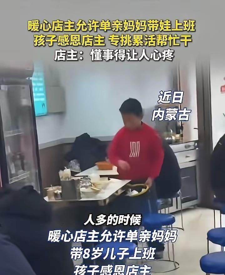 懂事到让人心疼!内蒙古呼和浩特,单亲妈妈求职处处碰壁,含泪求老板允许带娃上班,老板心软点头应允,没想到8岁儿子的一连串举动,直接让老板当场红了眼!网友:“这孩子太让人心疼,老板也是实打实的善人!” 这几天,呼和浩特的春寒依旧透骨。一家不起眼的临街饭馆门口,站着一对被生活逼到墙角的母子。女人是从河北老家过来的。男人早没了音讯,家里更没个能搭把手的老人。娘俩在异乡,就如无根浮萍。 偌大的城市,她连着几天四处碰壁。鞋底磨薄了不说,兜底的几张碎钞票眼瞅着就要见底。找活儿的理由极其现实,房租催命般地紧紧相逼,8岁儿子的学费更是压在心头的巨石。可被人拒之门外的理由往往更残酷。老板们不约而同地摆手:带个半大孩子算怎么回事? 前厅后厨乱哄哄的,磕了碰了谁能担这个责?小本生意可容不下这等随时会爆的麻烦。细算算这笔生存账,她哪是不要面子?分明是穷途末路的窘迫,硬生生把自尊心踩成了烂泥。 走投无路之下,她万般无奈,只好鼓起勇气,走进了这家不起眼的小餐馆。眼眶通红,死死攥着衣角的手指头都泛着白。 她带着哭腔求老板破个例。只要给口饭吃就行,保证儿子绝对不添乱。那姿态,低到了尘埃里。饭店老板是个见惯了人情冷暖的主儿。店里本就忙得脚打后脑勺,多塞个小孩简直是自找不痛快。可他抬眼瞅见女人眼里的绝望,再看看躲在她身后那个怯生生的小男孩。他终究还是咬牙点了头。 这个看似轻飘飘的决定,却砸出了一场远超所有人预期的震撼。这哪里像个刚满8岁的孩子。压根没人教过他店里的规矩。打从第一天踏进这门槛,他就自己摸了个小矮凳,缩在最不起眼的角落。饭点一到,这小家伙简直像只嗅觉灵敏的小狼狗。眼睛死死盯着大堂,连呼吸都收着劲儿。 只要有客人结账起身,他立刻攥着小拳头从台阶上蹦起来,一路小跑冲向那片狼藉的杯盘。沾满红油的碗碟被他小心翼翼摞成一叠。托盘压得他小身板直打晃,可那脚步却稳得出奇。抹布在他手里上下翻飞。桌角的油渍、客人吐在缝隙里的骨头渣,全被仔仔细细扫进簸箕。 这根本不是什么讨大人欢心的童真游戏。苦难早已融入血脉,化作刻在骨子里的生存本能。他深深体会过生活的艰辛,格外懂得长辈一路走来的不易与辛酸。他亲眼见过妈妈愁房租时掉的眼泪,听过被窝里压抑的哭声。知道这份活要是黄了,娘俩就真没退路了。 那些搬空酒箱的体力活他抢着干,地上的顽固油污他蹲着一点点抠,甚至连倒垃圾都要颠颠地跟着。老板实在看不下去,拉他去旁边歇会儿。他仰起满是汗印子的小脸说,多干点,你们就不那么累了。 这可是个本该在父母怀里满地打滚要玩具的年纪啊。他却坐在冷风口的台阶上,啃着干馒头灌凉白开。 有天晚上一直熬到夜里十点多。最后一波客人总算散了,妈妈还在后厨水槽边弯腰忙活。孩子趴在收银台上写作业。困得头一点一点,双眼泛红、不停揉着,明明已经疲惫不堪,却依旧强撑着不肯入睡,一心只想等妈妈下班回家,默默守在一旁静静等候。 老板心里酸得直抽抽,从冰柜里热了瓶牛奶递过去。这孩子接过来,第一句话竟然是找妈。非逼着妈妈先喝一口,自己才抱着盒子小口小口地抿。喝完了,把纸盒折得方方正正捏在手里。还有回端菜,开水全洒在了妈妈手背上。烫得立刻起了一层红斑。换作别的孩子恐怕早就吓哭了。 他连眼泪都没掉一滴。急忙冲上前,轻轻握住那只红肿的手,细心地吹着气。眉头紧紧皱在一起,嘴里不停轻声安抚,一遍遍念叨着别怕、不疼了。安慰完妈妈,转过身就拿起脏抹布去收拾地上的水渍。这种反向的照顾,简直像一把割人的钝刀子。 活了大半辈子、见惯了精明算计的老板,眼眶当场就湿了。这世上真有懂事得让人害怕的骨肉。这份懂事根本不是天生的,是硬生生逼出来的。他把小孩子的任性全都碾碎了,连血带肉咽进了肚子里。 老板一开始不过是动了一丝恻隐之心。可面对这份知恩图报的沉甸甸,他也被彻底拉进了这场羁绊。承诺的工资不仅一分没少过,后厨的锅里还总会特意给娘俩温着热饭。文具零食更是时不时地塞过去。 三月中旬,这段夹杂着辛酸与温暖的视频在网上彻底炸了锅。热搜里的看客们,笑着笑着就沉默了。我们总爱抱怨这世道走得太快、太冷酷。每个人都忙着斤斤计较,忙着在自己的泥坑里挣扎求生。可你看看这场没有签过任何契约的双向奔赴。 不过就是一个心软的收留,配上了一双拼命报恩的小手。没有谁站在道德的制高点上去施舍同情。他们就在市井最粗糙的烟火气里,把人性的底色擦得贼亮。 善意这东西,从来都不是泼出去就没影的水。你今天给人撑了把伞,明天这伞骨没准就能替你挡大风。在这片钢筋水泥筑起的丛林里。这对母子没有被冷眼逼到绝路,那个好心人也收获了最纯粹的灵魂反哺。 参考信息:民生大参考.(2026-03-16).内蒙古一店主允许单亲妈妈带8岁儿子上班,顾客一走孩子赶紧收拾专门干累活:“懂事得让人心疼!”