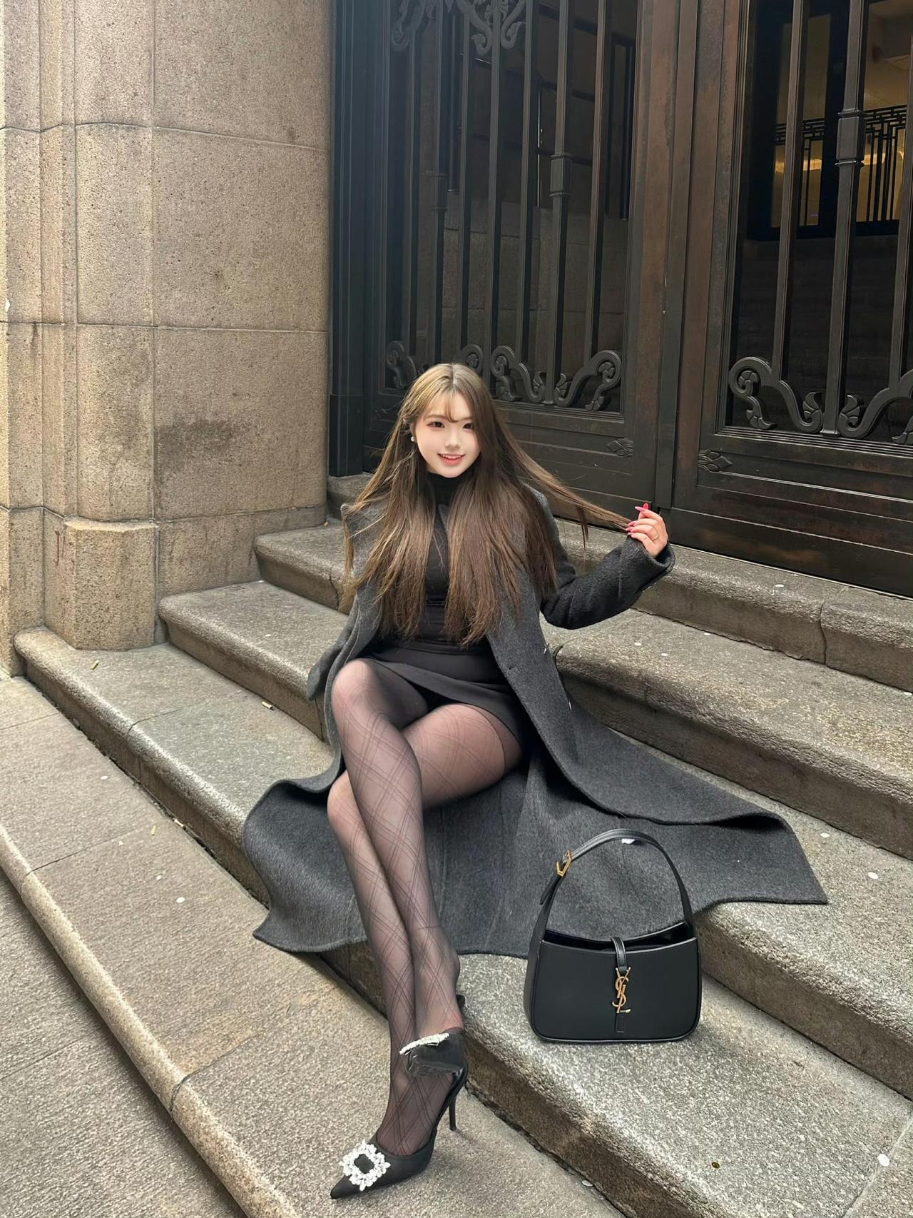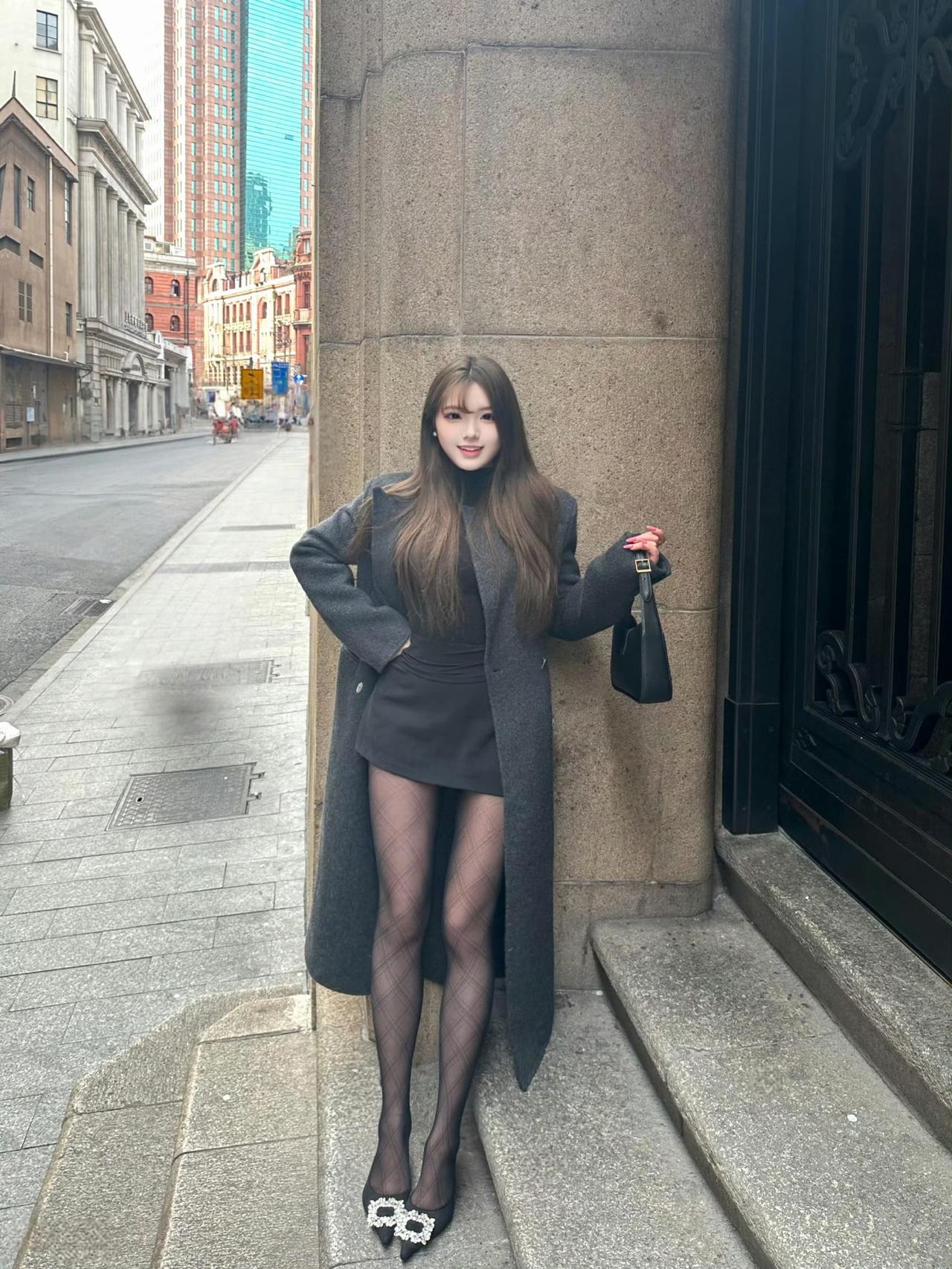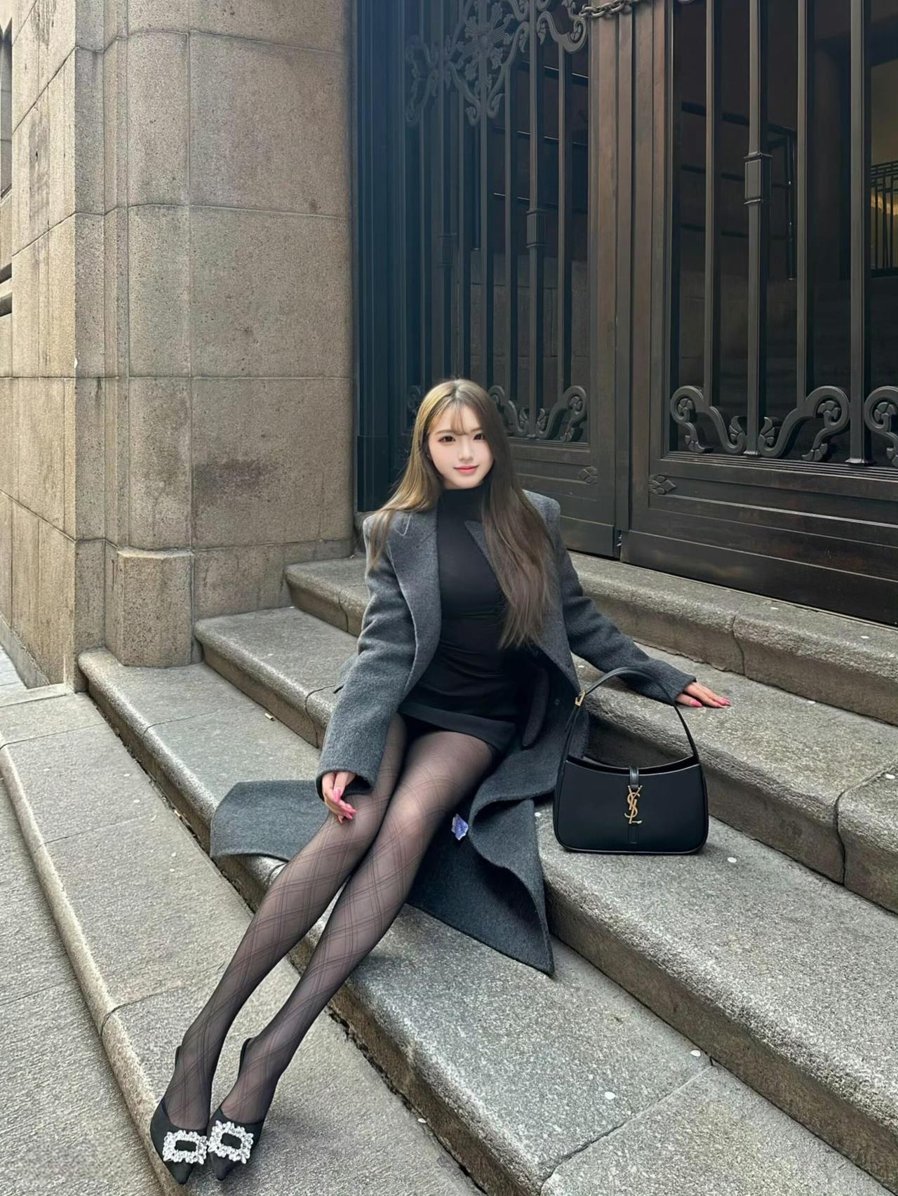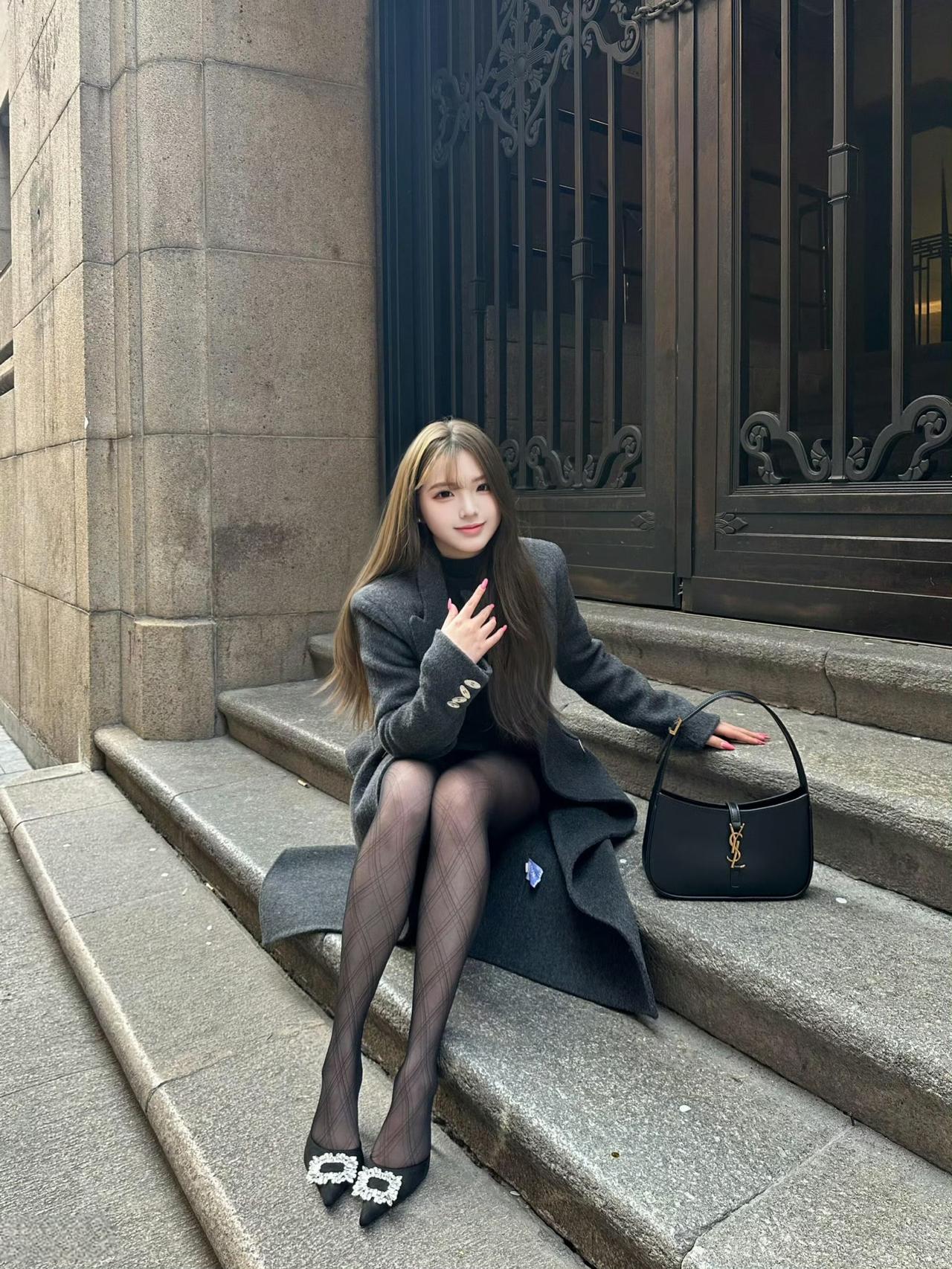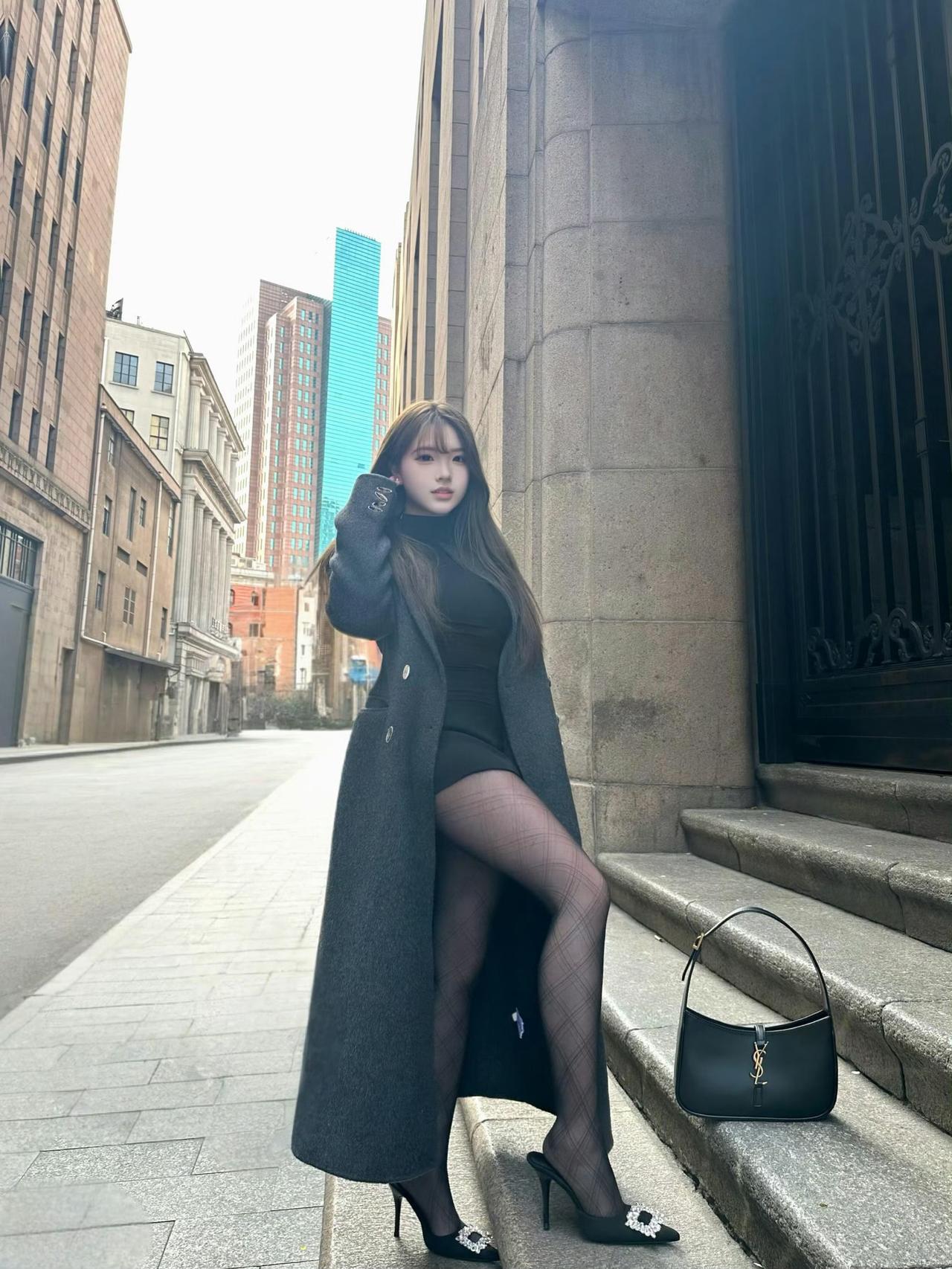 这套是酷飒优雅都市风,核心是灰黑叠穿+长外套:长款大衣自带松弛气场,内搭全黑套装显利落,菱格黑袜+装饰扣高跟鞋强化精致细节,简约黑包平衡整体。大衣高级配色 成熟风大衣搭配