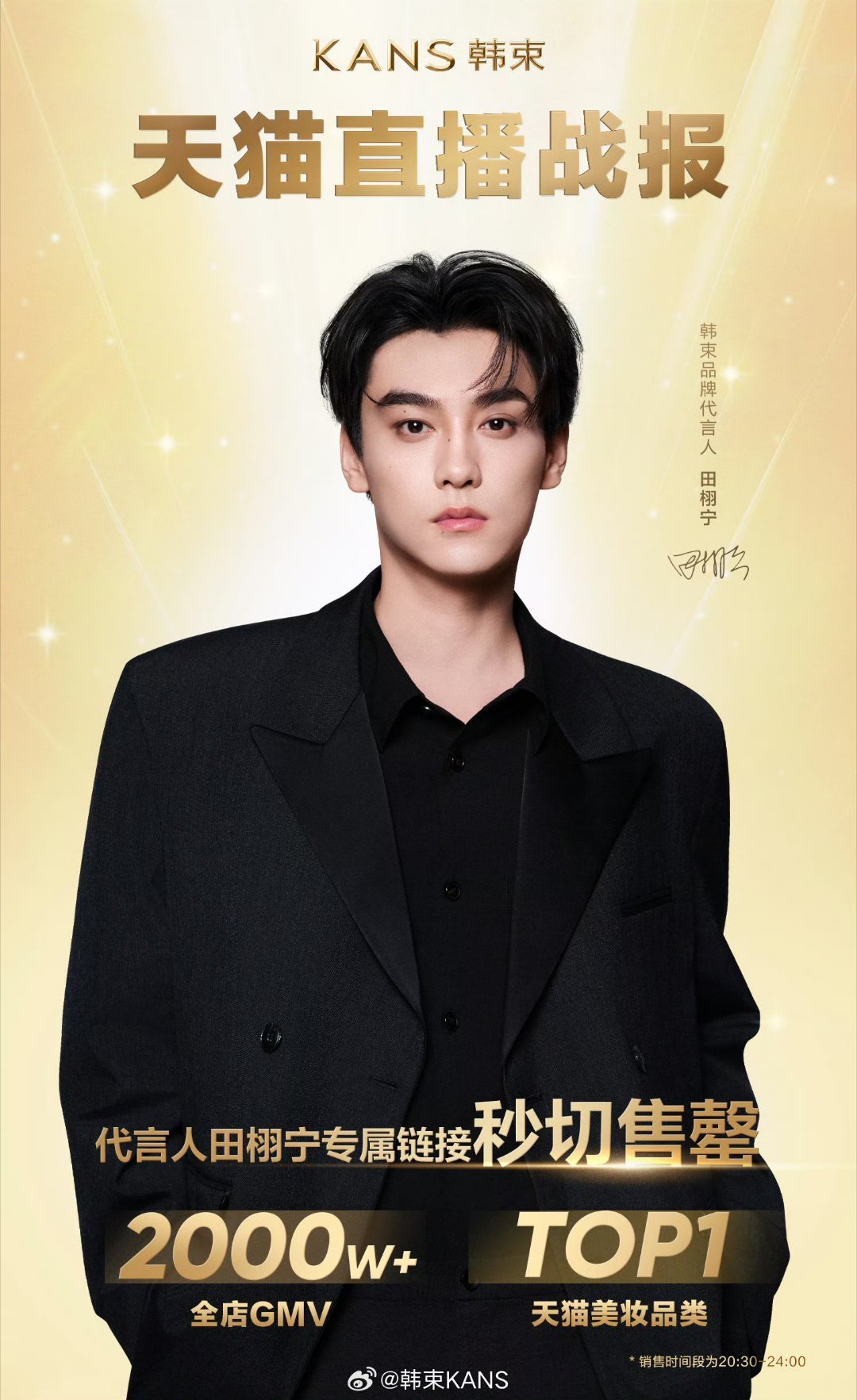 田栩宁 韩束品牌直播官方销量战报🔥专属链接秒切售罄!销售额突破2000万!登顶天猫美妆品类TOP1!🔥 田栩宁韩束直播销售额