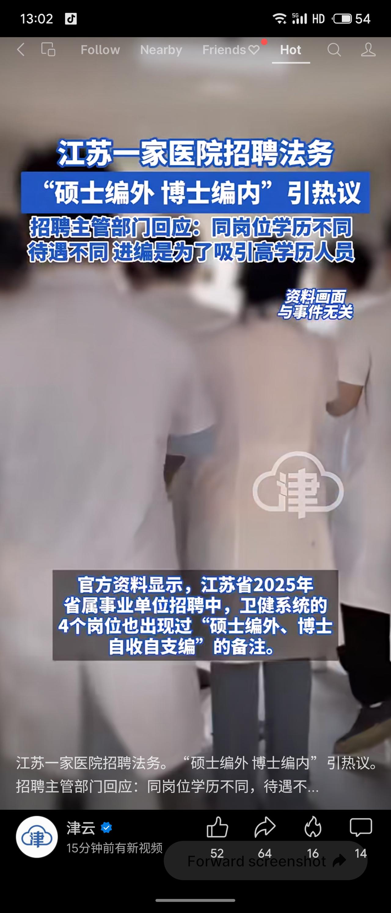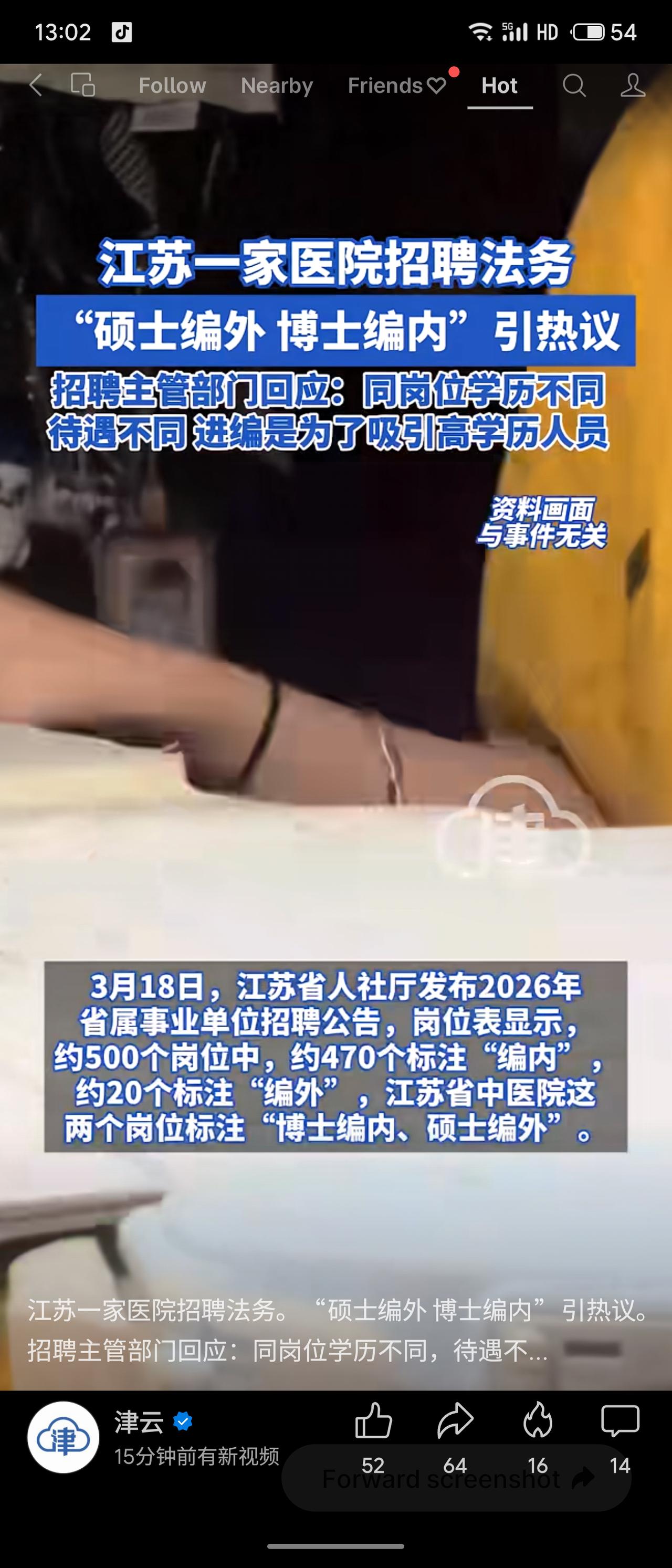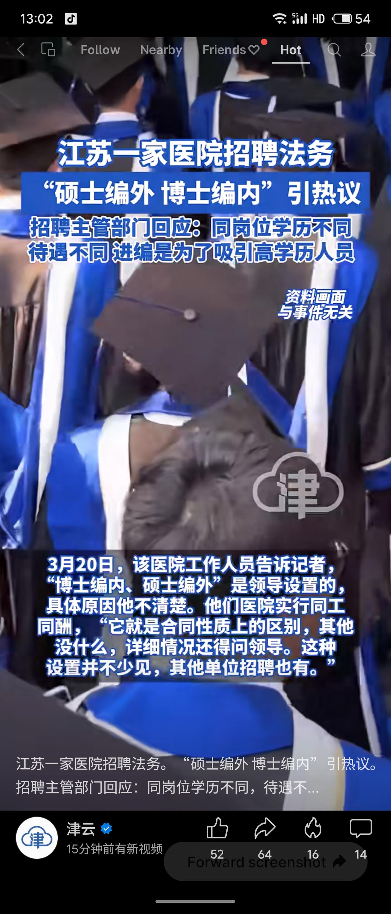 江苏省中医院在2026年事业单位招聘中,为审计与法务处岗位设置“博士编内、硕士编外”的差异化待遇,引发社会热议。招聘主管部门回应称,此举旨在吸引高学历人才,编内编外待遇不同,且此前已有类似做法。医院方面表示实行同工同酬,区别仅在于合同性质。 该事件折射出事业单位招聘中学历与编制挂钩的现实逻辑。从人才引进角度看,给予博士编制确有激励作用;但从公平性角度看,同岗不同编易引发对硕士群体职业发展权的担忧。如何在吸引高端人才与保障岗位公平之间取得平衡,仍需制度进一步规范与透明。