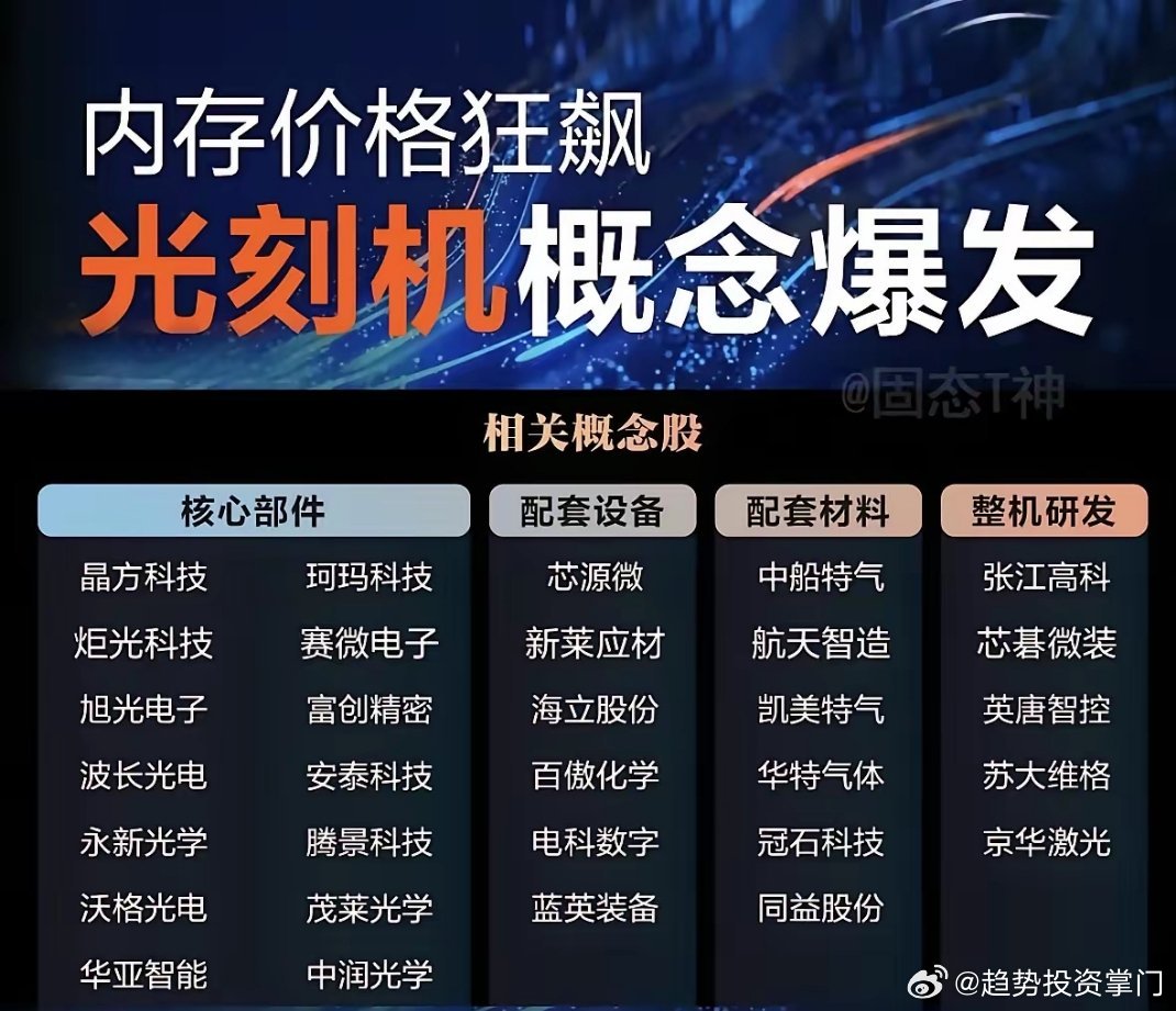 光刻机产业链核心公司速览一、整机/生态(核心)- 张江高科:参股上海微电子(SMEE),国产光刻机资本平台- 芯碁微装:直写光刻龙头,封测/面板领域市占率领先- 上海电气:SMEE第一大股东,提供制造支撑- 华卓精科:双工件台技术,独家供应SMEE前道光刻机二、光学系统(光刻机核心部件)- 茂莱光学:SMEE光学核心供应商,获ASML认证- 福晶科技:光刻光源晶体龙头,进入ASML供应链- 奥普光电:聚焦EUV光学研发,布局光栅编码器- 波长光电:量产DUV投影物镜,具备110nm分辨率三、光源/激光系统- 炬光科技:国内独家光场匀化器,配套DUV光刻照明- 凯美特气:获ASML认证,供应光刻气- 华特气体:高纯电子特气,覆盖28nm及以下制程四、精密结构/真空/温控- 富创精密:ASML认证精密金属件供应商- 新莱应材:高纯真空/气体管路系统提供商- 同飞股份:光刻机激光器温控国产龙头- 中瓷电子:供应精密陶瓷零部件五、光刻胶/配套材料- 南大光电:量产ArF光刻胶,通过28nm验证- 彤程新材:布局KrF/ArF全品类光刻胶- 上海新阳:覆盖I线至ArF浸没式全系列光刻胶六、清洗/辅助设备- 蓝英装备:ASML EUV清洗设备供应商- 广立微:光刻工艺EDA,提升设备良率七、其他核心配套- 赛微电子:MEMS镜片供应ASML- 苏大维格:光刻机整机+定位光栅尺,出口海外⚠️ 风险提示:仅产业链梳理,不构成投资建议;国产替代、技术突破及订单落地存在不确定性。光刻机产业链
