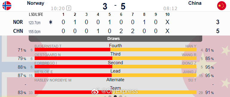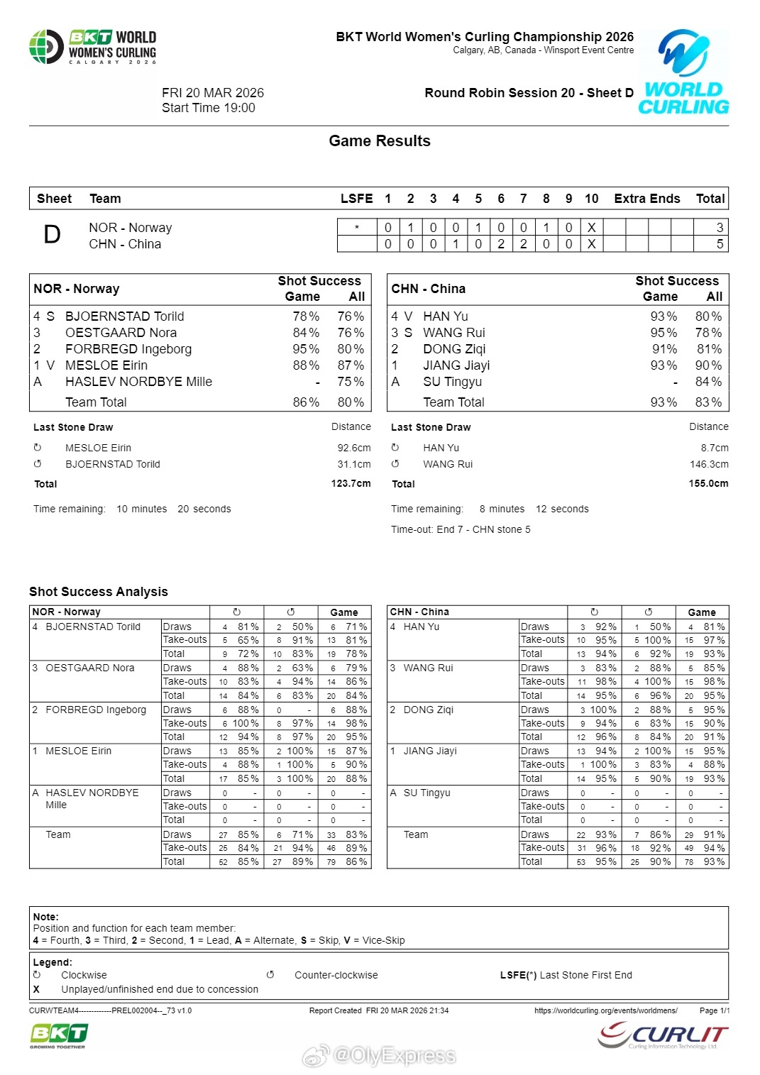 【女子冰壶世锦赛中国5-3挪威 静候土意结果】2026年女子冰壶世锦赛 3月20日卡尔加里,女子冰壶世锦赛循环赛最后一轮,中国队稳站稳打以5-3击败挪威,战绩为6胜6负,能否拿到最后一个出线名额要看土耳其与意大利的比赛结果,目前八局过后双方战成7-7平。