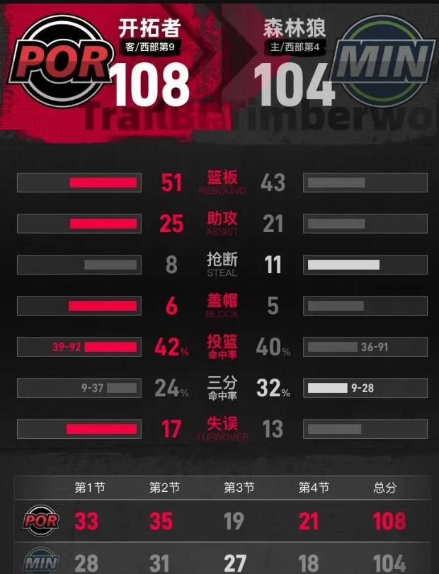 108-104?开拓者客场把森林狼给拆了?没成想——戈贝尔坐镇的主场,愣是让一群"光脚"的给冲了!好家伙,森林狼这"伪强队"的标签,这下是真撕不掉了。 最后那一分钟,我咖啡都凉了手还在抖。森林狼领先1分,球权在手,按理说该收比赛了吧?结果兰德尔那球投的,跟扔砖头找筐似的,咣当一声——心凉了半截。回头开拓者根本不叫暂停,格兰特拔起来就扔,球划出弧线那零点几秒,我以为是利拉德魂穿了呢!唰!反超三分,血压直接拉满。 再说那克林根,好家伙,22岁的新秀面对两届DPOY戈贝尔,21分12篮板,还顺手送3个大帽。这孩子在禁区里,跟逛自家后院似的,有脚步有策应,把戈贝尔调得团团转。阿夫迪亚那块"砖",哪里需要往哪搬,25+8+5填满数据栏。霍勒迪那12次助攻,老将油子,全喂到年轻人嘴里了。 说白了,这就是"光脚不怕穿鞋"的狠劲,撞上了"穿着鞋却怕湿脚"的矫情。森林狼阵容看着唬人,关键时刻掉链子这老毛病,一点没改。领先不会打,落后靠蒙三分,这哪是狼?这是披着狼皮的哈士奇。 开拓者这一仗,不是爆冷,是宣言。他们告诉联盟:重建不是摆烂借口,年轻不是软弱理由。那记绝杀三分,砸碎的不只是森林狼的主场不败金身,更是那套"唯天赋论"的旧秩序。 狼性不足,何以称狼?有血性,方能开疆!格兰特26分克林根21+12 开拓者擒森林狼取三连胜