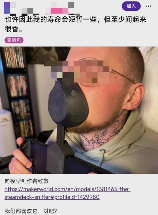 【steamdeck奇怪的配件又增加了】Steam Deck掌机之前因为一个小彩蛋而火了起来,那就是散热口的味道。据说这个味道成为部分有气味癖好的玩家的追捧。现在有大神用3D打印做了一款专门吸Steam Deck散热口味道的配件,看起来真的十分奇特。 玩家配文:也许我的寿命会因此变短一些,但至少闻起来很香,还配上了自己“享受”时刻的自拍照,还有3D打印模型的连接。 你有闻过Steam Deck散热口的味道不?