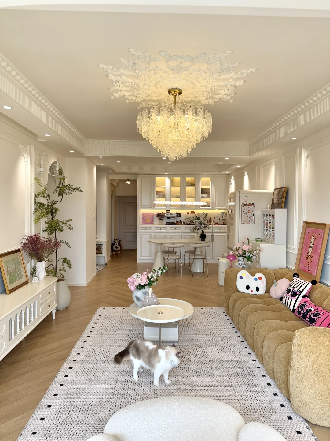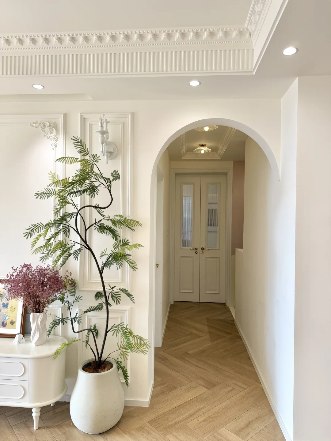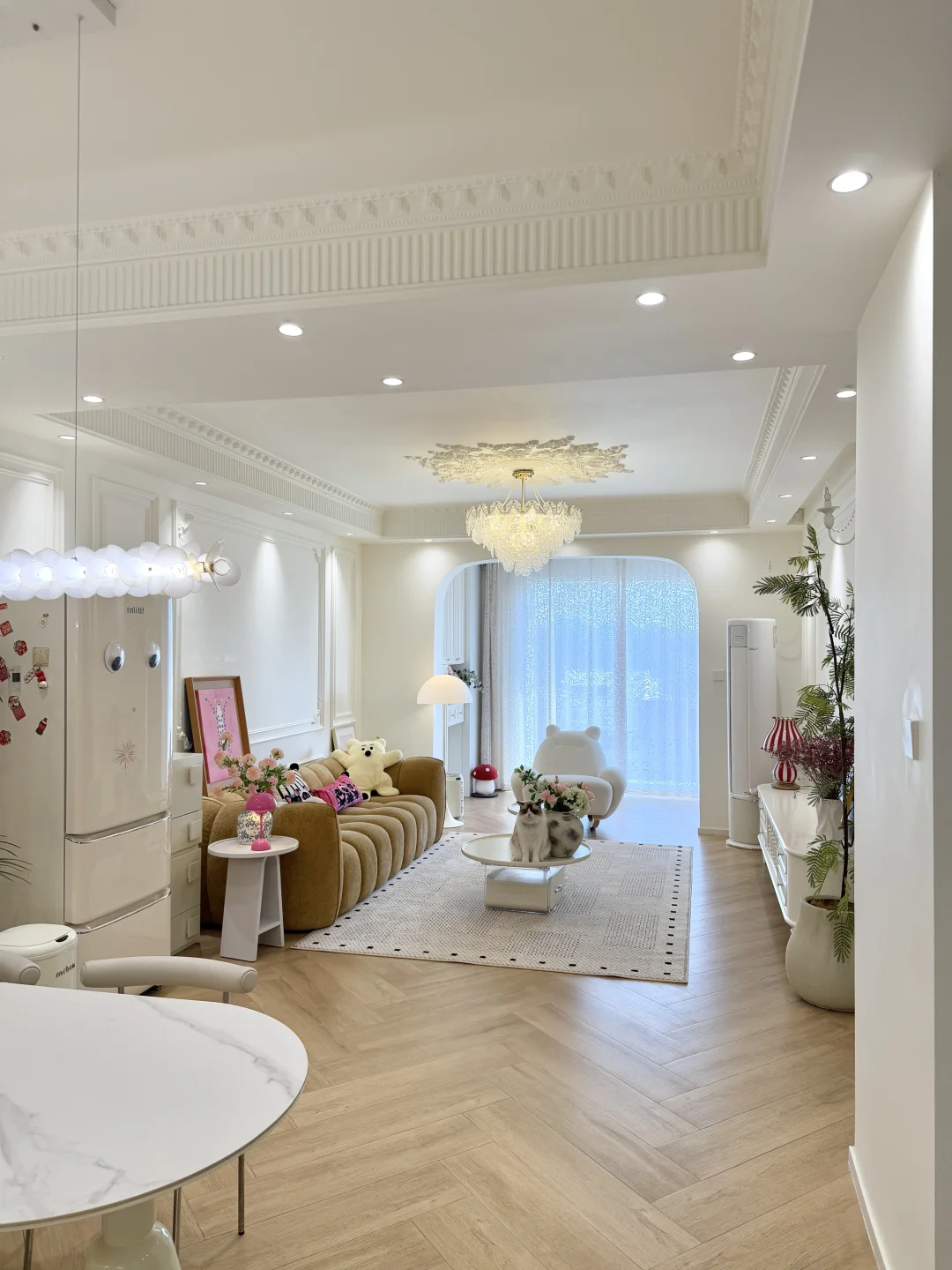 花40w在小县城买房 又装成法式奶油风 今年入住第3年真的越住越好住 分享下我的装修小思路吧 ❶:墙面通刷珍珠白+pu线条造型耐看还不容易过时 ❷:地面通铺20*90人字拼木纹砖,比木地板更省钱 ❸:柜子买的板材,让木工打的柜体,柜门是定制的 ❹:阳台一半封闭,一半做了花园和洗衣晾晒区 ❺:厨房做了开放式,跟餐厅动线一体更显大 ❻:没留客房,让木工做了衣帽间,给对象用真香 ❼:软装以浅色系为主不翻车 ❽:别找熟人帮装修,就连亲戚也不行