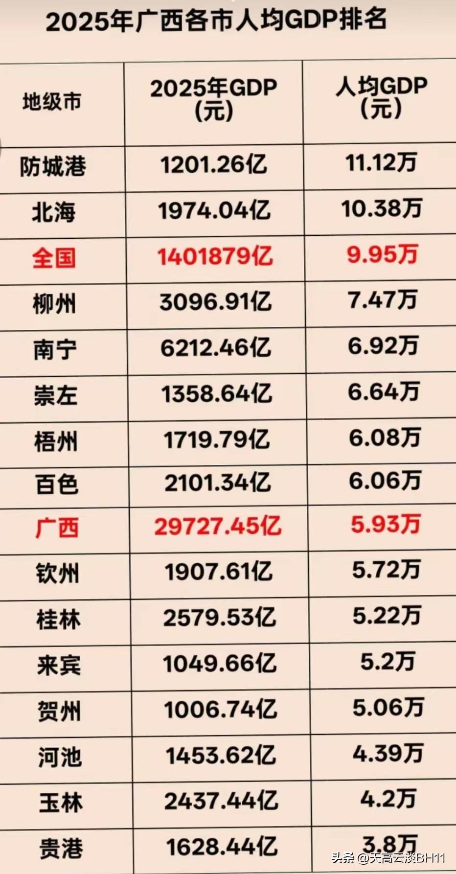 几乎人尽皆知,防城港与北海是广西各城市人均GDP排名前二的城市,都超过十万元大关,也是广西仅有的两个人均GDP超过全国平均水平的城市。 然而,有些人却酸溜溜地不服气,认为这两座城市不过是占了人口少的便宜,实则大错特错。 北海与防城港同属北部湾经济区,占据了地利人和的优势。数据显示,两市十四五年均增速分别为8.1%和7.8%,远远领先于其他城市。而同一区域内的钦州却落后了,人均GDP甚至未达到广西的平均值。 柳州则是唯一的“另类”,GDP增量为 -80 亿元,十四五年均增速却还有 5.0%,这是为何?