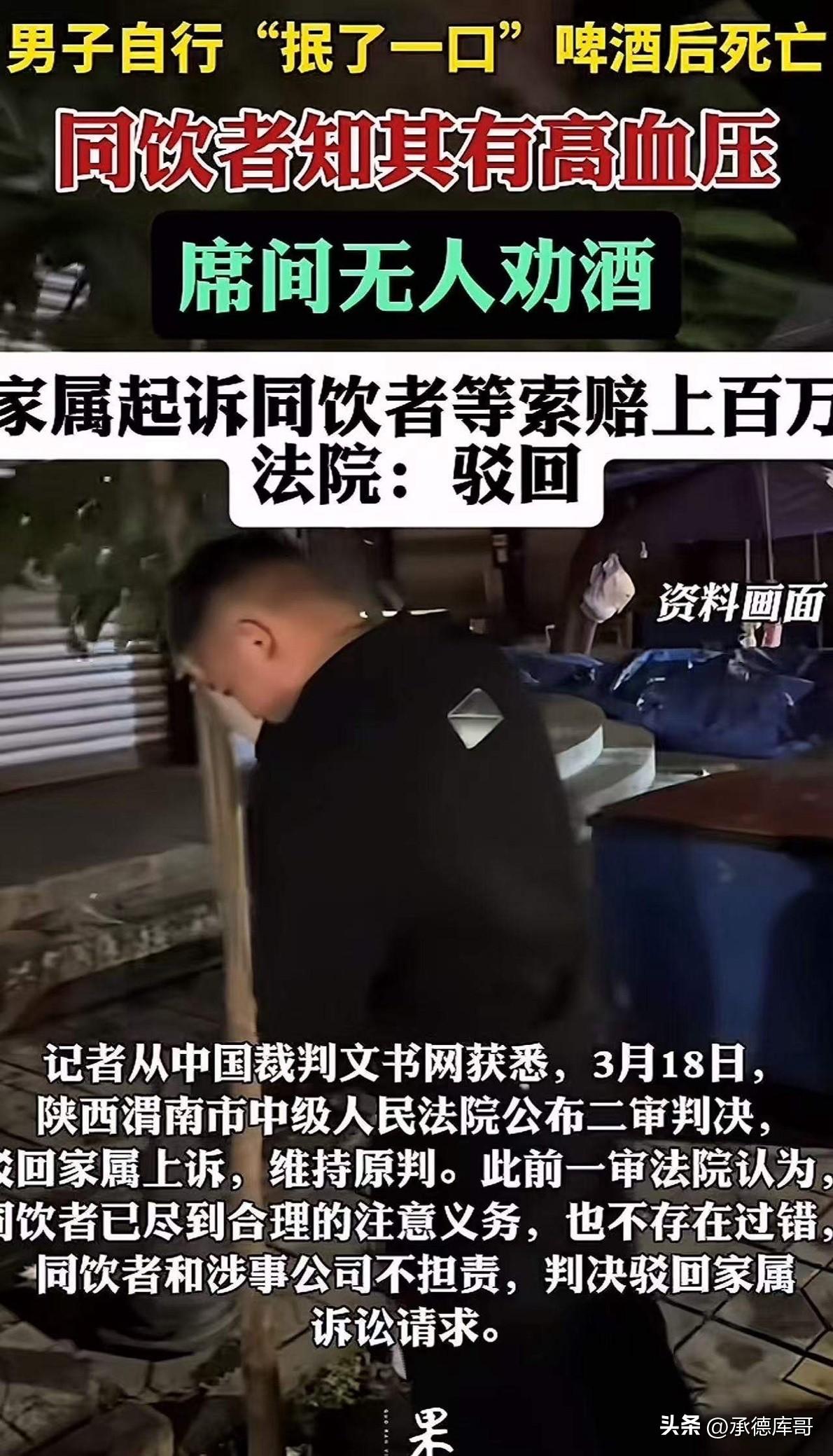 这次必须给法院点赞!陕西富平,男子在酒桌上主动抿了一口啤酒猝死,家属张口索赔143万!法院硬气判决:驳回!网友:吓得我都不敢请朋友喝酒了! 男子吴某赴某公司洽谈项目,晚餐时,他主动告知自己患有高血压不宜饮酒。 公司负责人也很配合,没带酒,席间无人劝酒。这本该是一场安全的饭局。 可就在就餐快结束时,吴某为了表示一下感谢,主动给自己的小玻璃杯倒了三分之一啤酒,抿了一口。 次日,他被发现在酒店房间死亡。 家属一纸诉状把同桌喝酒的3个人和那家公司全告了,张嘴就要赔偿143万余元! 理由很“充分”:你们明知道他有高血压还让他喝酒,没尽到安全保障义务,人是在跟你们吃完饭后死的,你们得赔! 法院一审驳回,二审维持原判。法院的判决理由很明确:吴某明知自己不宜饮酒却主动饮酒,同饮者已尽到合理注意义务,不存在过错。 说实话,看到这个判决,我只想说四个字:于法有据。 近年来,“酒后出事同桌赔偿”的案件屡见不鲜,以至于很多人谈酒色变。但法律从来都不是“谁死谁有理”的和稀泥。安全保障义务是有边界的,不能无限放大。 本案中,吴某事先声明有高血压,公司负责人就没带酒;席间无人劝酒;吴某是主动倒酒、主动喝,只抿了一口。这种情况下,你能说同饮者有什么过错?他们总不能把吴某的嘴封上吧。 更关键的是,吴某作为完全民事行为能力人,对自己的身体状况和饮酒风险应当有充分认知。明知山有虎,偏向虎山行,出了事却要别人担责,这于情于理都说不过去。 法院的判决传递了一个清晰信号:每个人都应该是自身安全的第一责任人。劝酒的要承担责任,但主动饮酒的也要对自己负责。法律的归法律,人情的归人情,不能动辄“死者为大”就让人无辜买单。 对这件事,你怎么看?
