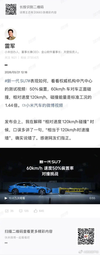 · 态度是王道:网友调侃,雷军可能是全中国“认错最快”的CEO。在24小时内,用最坦诚的方式回应,对比某些车企遇到问题就“冷处理”或“硬刚网友”的做法,这份“有错就认”的担当,反而赢得了路人缘。· 本意不坏:很多人看出雷军是想把复杂的物理概念“翻译”给普通人听,让大家明白“60+60”的测试强度很大,结果用力过猛,牺牲了科学性。这种想把专业讲得接地气的初衷,大家能理解。· 结果更重要:真正买车的人,更关心的是车到底安不安全。而小米SU7的碰撞测试结果(车门解锁、气囊打开、车身结构完整)是实打实的数据,这些硬核成绩单,远比发布会上一句口误更有说服力。