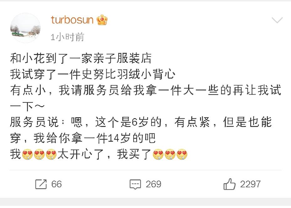 孙俪开心发文!3月21日下午,孙俪开心发文,隔着屏幕都能感受到她那溢出心头的快乐,到底什么事让她如此雀跃?看完文字,网友们都笑了。 孙俪开心发文道:和小花到了一家亲子服装店,我试穿了一件史努比羽绒小背心,有点小,我请服务员给我拿一件大一些的再让我试一下,服务员说:“嗯,这个是6岁的,有点紧,但是也能穿,我给你拿一件14岁的吧。” 孙俪开心发文,还配了一串[爱慕]的表情:“太开心了,我买了!” 原来,让孙俪乐开花的,是服务员那句“6岁,14岁”,作为两个孩子的妈妈,身材能被误认为穿得进童装,这份隐形赞美可比任何夸奖都受用。 难怪她毫不犹豫买下那件背心,买的哪是衣服,分明是一整天的好心情。 网友们纷纷留言:“换我也得发条朋友圈!”“这服务员太会说话了。”,还有人说,娘娘这开心劲儿,隔着屏幕都被传染了。 一件小背心,一句无心话,就能让一天变得闪闪发光,快乐有时就这么简单,你说是吗?