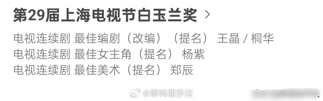 不过说起来,杨紫也确实还拿一下了,她可是被白玉兰提名过三次,分别是: