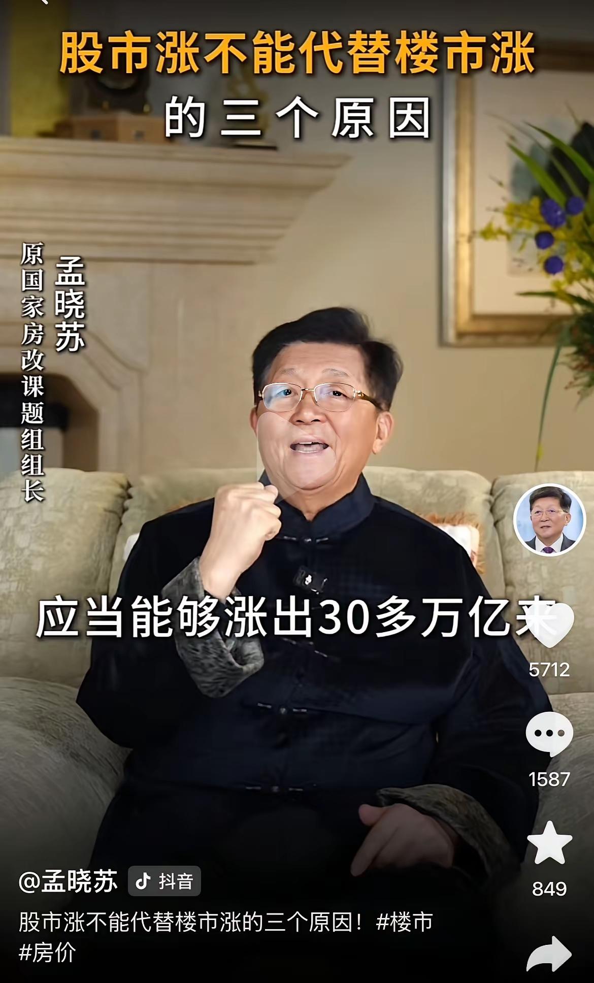 房地产专家孟晓苏给出了房价上涨的理由。他说股市的体量小,才100万亿,再怎么涨,才涨30万亿;楼市规模450万亿,涨上去,老百姓财富增加。 老百姓信心回归,就会继续进场接盘,买房子,买房子,又正面促进房价大涨,于是财富继续增加。 孟晓苏不愧为房地产专家,说的透彻,看的明白。不知道孟晓苏又买了几套房?现在拥有几套房? 还准备买几套房? 既然认为房价要涨了,孟晓苏若买房,是不是准备去跟随?房市感悟 房价变局 房产清醒论 房地产伪专家 高先生聊楼市 房市抄底信号 房价涨跌怪象 对楼市影响 房地产资本困境 房市信心 房价一夜间暴涨