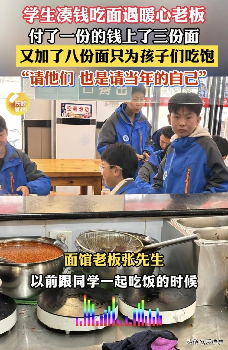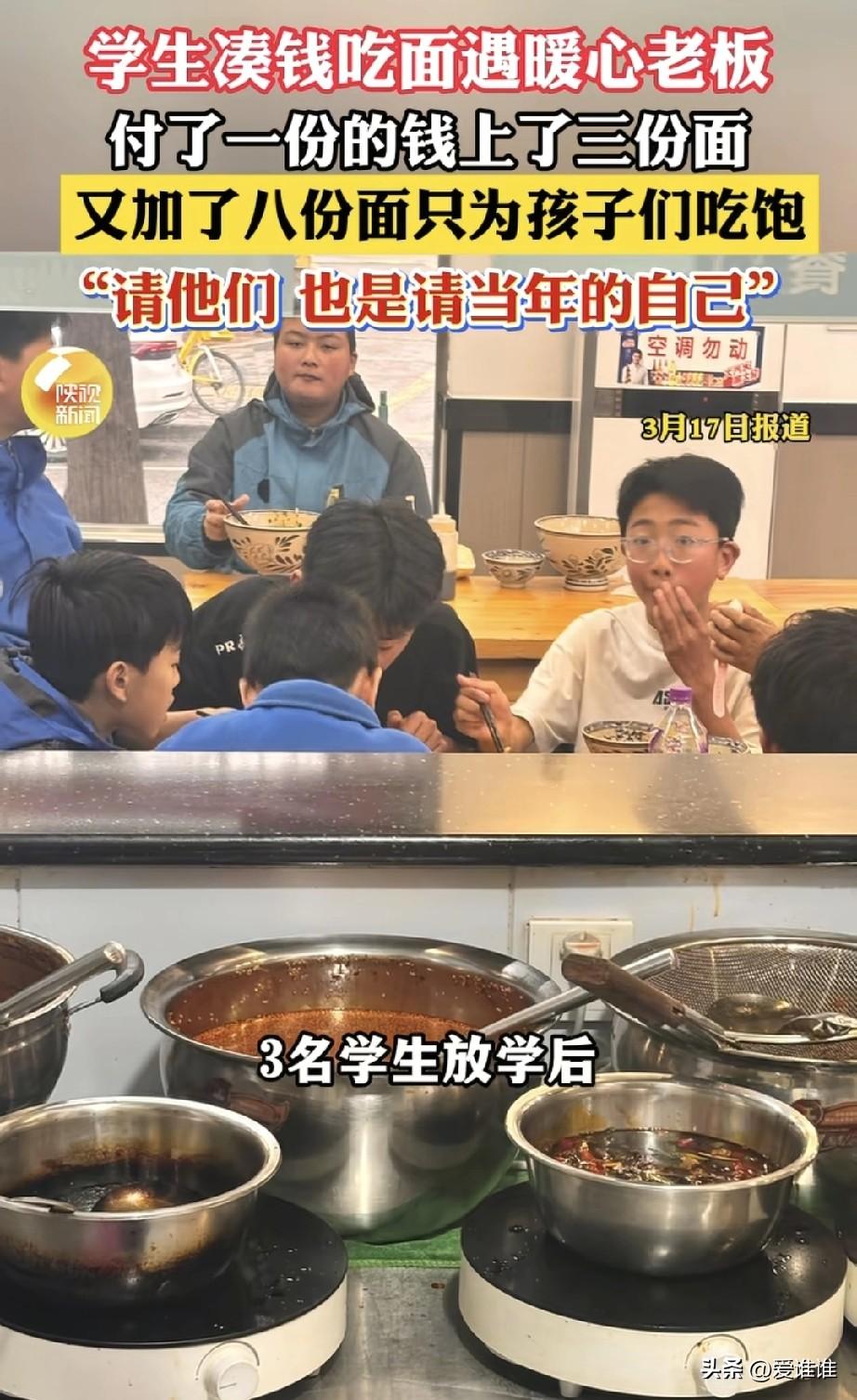 “大气!”几名初中生凑钱来到一家面馆吃面,老板看出他们的窘境,大方的表示:“钱不钱的无所谓,我请你们吃!”不一会为他们每人免费端上一碗面,几名初中生吃完痛快利索的帮着老板打扫卫生,老板说:“我这不仅是在请你们,也是在请曾经年少的自己!” 2026年3月20日中午,陕西西安的一条街巷里,开面馆的九五后老板张先生正忙着招呼客人,他注意到店门口有三个穿着校服的初中生,来来回回走了好几趟,时不时往店里张望,却始终没有进来。 张老板主动走出门,招呼他们说:“先进来坐,钱不够没关系,先进来看看。”三个孩子这才不好意思地走进来,磨蹭了半天,最后只点了一份店里的招牌爆肚面。张老板一看就明白了,这几个孩子是凑钱来吃饭的。 面条端上桌,三个人你一口我一口,吃得很快,张老板担心他们不够吃,二话没说,主动给他们每人续了一份面,孩子们吃完后觉得味道确实好,又叫了几名同学过来,张老板见状,又接着续面,前前后后一共免费加了八份面,还额外添了配菜。 他后来说,自己读书那会儿家里也不宽裕,经常和朋友凑钱吃饭,看着这几个孩子,就好像看见了当年那个省着花钱的自己,“就当是宴请了年少的自己”。 他本来没把这事放在心上,没想到有顾客把这一幕拍下来发到了网上,一下子引来了好多人的关注,更让他意外的是,那几个孩子看到视频后,主动在评论区帮他宣传面馆的地址。 后来再来店里吃饭,瞧见客人多,就悄悄帮着收拾桌子、端碗碟,一声不吭地忙前忙后,张老板说,孩子们的这份心意比什么都值。 然而就在今年一月二十五号晚上,四川乐山夹江县的一家面馆门口,却上演了完全不同的一幕,一个从辽宁来旅游的大学生邢先生走进了一家挂着“免费加米线、加面”招牌的面馆。 他点了一碗十块钱的牛杂米线,吃完第一碗后顺利续了一次面,当他端着碗想续第二次的时候,老板拦住他说,再加要收三块钱。邢先生指了指墙上“免费加面”的招牌,问为什么第二次就要收费,老板解释说本地规矩就是只能免费续一次。 两个人谁也说服不了谁,老板直接把他面前的碗收走了,邢先生掏出手机准备拨打12315投诉,没想到老板抢先一步报了警。 民警赶到现场后,当着面馆里其他顾客的面说了一句“三块钱都不愿意出吗?还不够我油钱呢”,这话被邢先生录了下来,旁边还有围观的客人跟着起哄,有人说“给他十块钱让他赶紧走”。 最后老板把十块钱餐费退给了邢先生,邢先生这才离开,但事情并没有就此结束,那段录音被发到网上后很快发酵,当地相关部门成立了联合调查组,一月二十八号发布了通报:面馆因为招牌上写着免费加面却没有标明限制次数,实际收取未标明的费用,违反了价格法的相关规定,被责令拆除招牌并接受处罚。 出警的民警也因为处置方式不当被调查处理,公安机关向邢先生道了歉,涉事的老板通过市场监管部门转给邢先生五百块钱作为补偿,邢先生在一月三十号把这五百块钱连同之前退的十块钱,又自己添了十块,总共五百二十元捐给了慈善基金会。 后来邢先生把自己的网名改成了“四川续面当事人”,还特意找了一家成都的面馆做对比,那家店的老板不仅爽快地给他续了两次面,还主动往碗里加了一勺臊子,两下一比较,网友们议论纷纷,有人说他较真,也有人支持他较这个真。 这两件事正如一位网友的评论:“3块钱能买一碗面,但买不回一份信任,而免费续的那8碗面,换来的是一群孩子心里一辈子的暖!”
