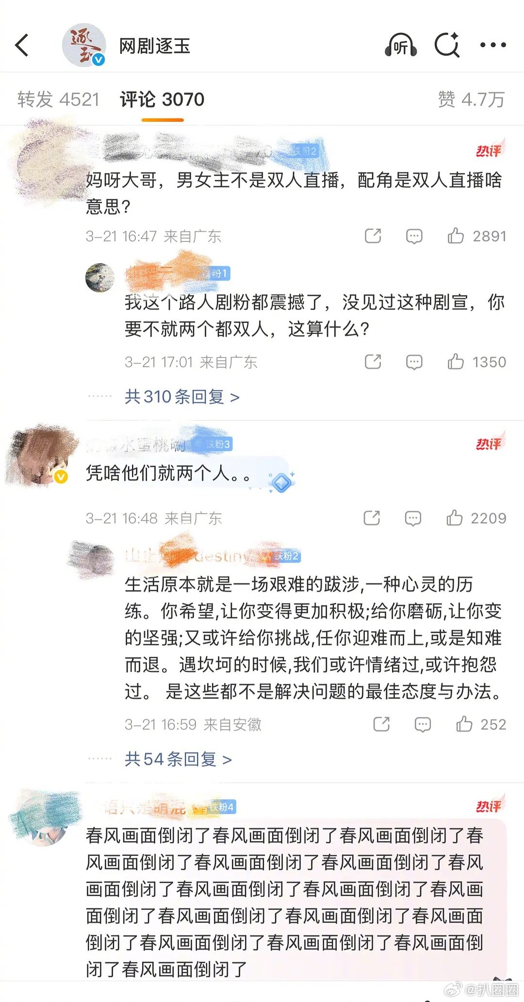逐玉评论区现状起因是主cp粉不满副cp双人直播陪看,而主cp是四人陪看~
