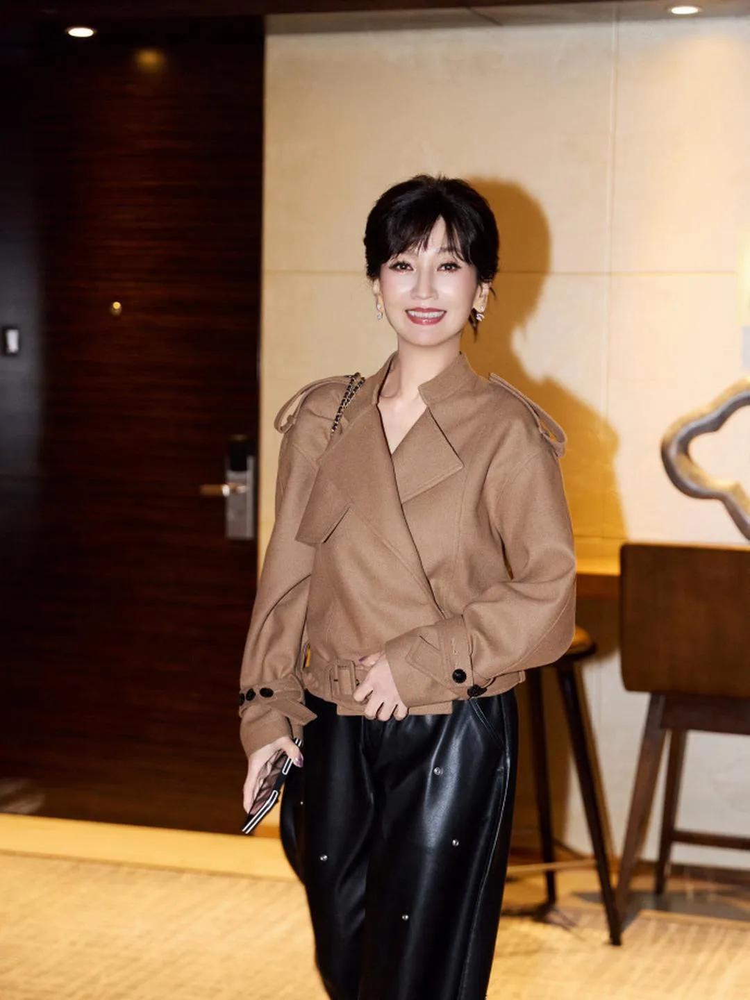 赵雅芝真的是奶奶辈穿搭的天花板!🧡 驼色短款夹克搭配黑色铆钉皮裤,简约又高级