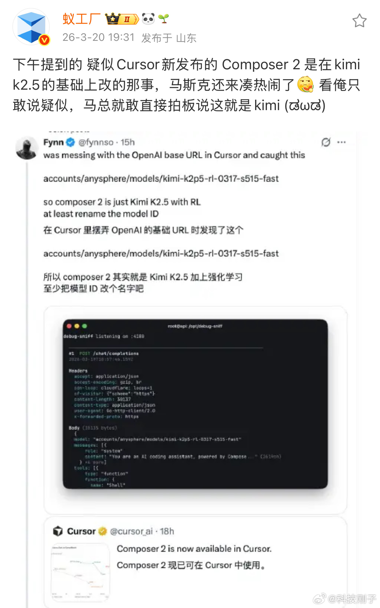 马斯克为Kimi撑腰 3月20日Cursor发布的Composer 2模型深陷“套壳”争议,海外开发者扒出其底层与Kimi K2.5高度关联,马斯克直接下场实锤“这就是Kimi 2.5”,让这场行业热议再添热度。Kimi官方随后回应,证实双方为合规商业合作,还以趣味话术感谢马斯克,尽显技术自信。