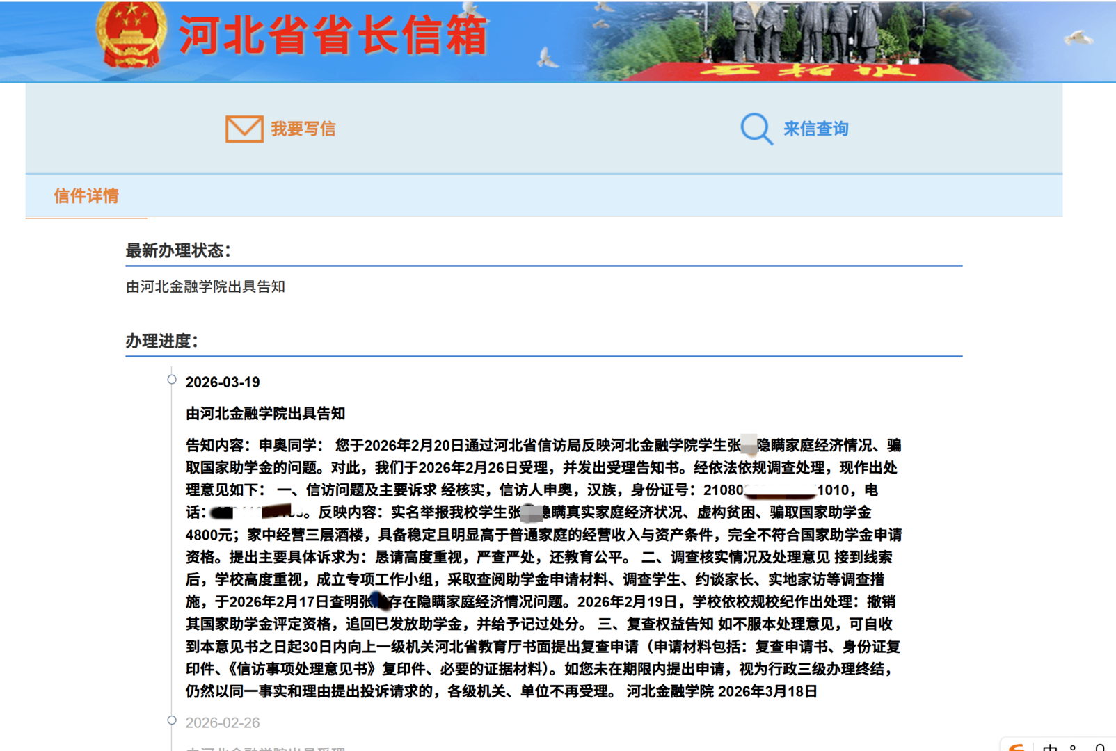 通过申奥提供的查询信息,河北金融学院3月18日通过省长信箱对于此事作出回复。回复称,今年2月份,申奥通过河北省信访局反映该院学生张某隐瞒家庭经济情况、骗取国家助学金的问题。接到线索后,学校高度重视,成立专项工作小组,采取查阅助学金申请材料、调查学生、约谈家长、实地家访等调查措施,于2月17日查明张某存在隐瞒家庭经济情况问题。2月19日,学校依校规校纪作出处理:撤销其国家助学金评定资格,追回已发放助学金,并给予记过处分。