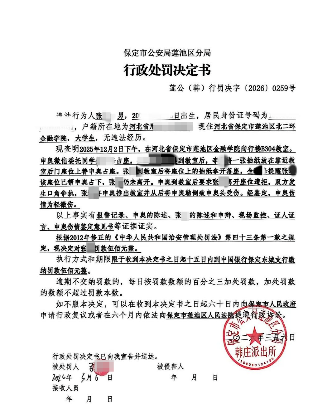 申奥提供的一份时间为2026年3月6日,盖有保定市公安局莲池区分局韩庄派出所鲜章的行政处罚决定书提及,违法行为人为张某,时间为2025年12月2日下午,地点在河北金融学院尚行楼B304教室。申奥微信委托同学占座,此后张某到所占座位落座,同学提醒后张某仍未离开。申奥到教室后要求张某离开座位遭拒,双方发生口角争执,张某将申奥推出教室并从后将申奥勒倒致申奥头受伤。经鉴定,申奥伤情为轻微伤。