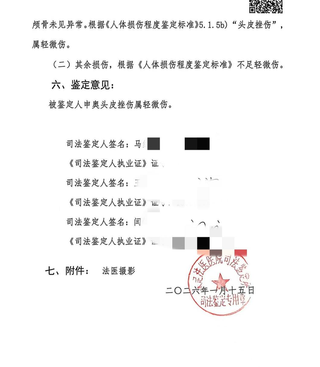 随后,申奥报警,其称今年1月伤情鉴定结果正式出具,自己伤情为头部外伤,构成轻微伤;而张某经检查,身体无任何损伤。