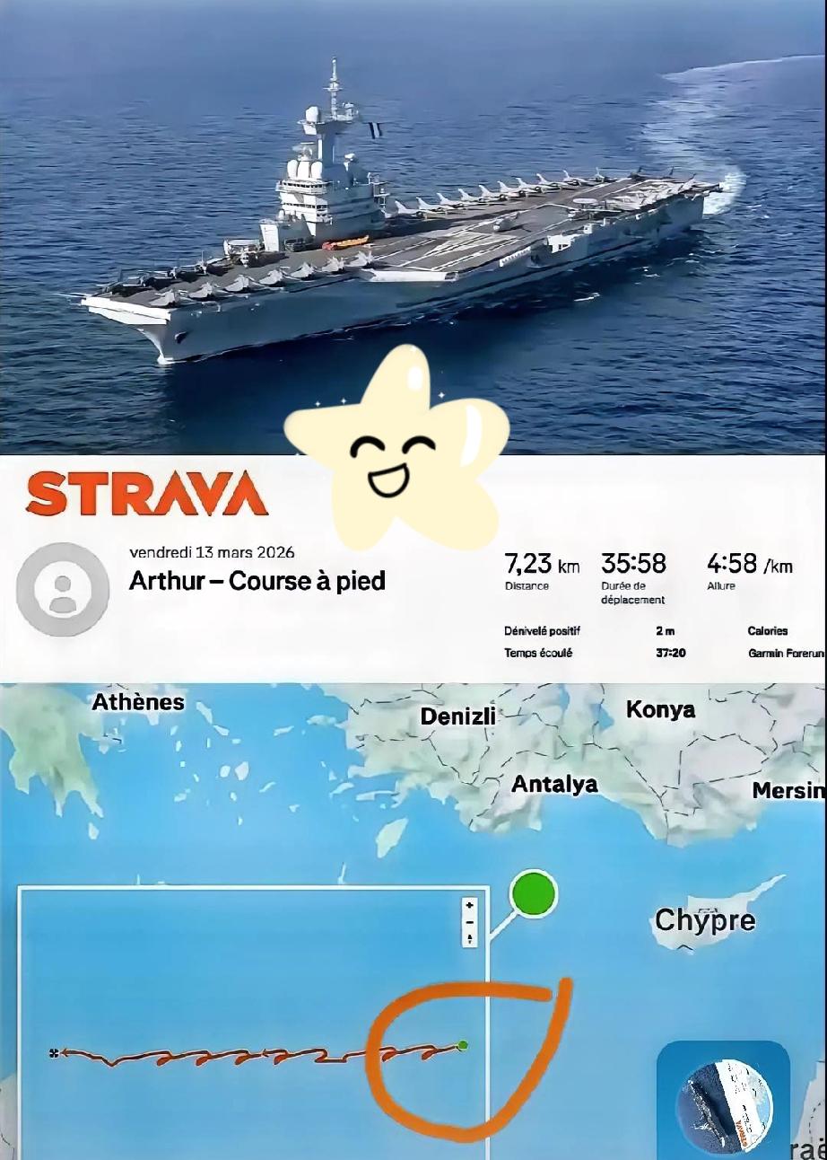 真的被法国军队这波操作整神了。 堂堂一艘国之重器航母,行踪那是绝密中的绝密吧?结果底裤都被自己人扒光了。 原因竟然是一个军官为了刷步数! 这哥们在甲板上跑了7公里,戴着佳明手表,反手就把数据同步到了那个运动APP上。 重点是,他账号还是公开的! 那条橙色的GPS轨迹,在茫茫大海上画得那叫一个清晰。 记者拿卫星图一对照,位置直接锁定在塞浦路斯外海,离土耳其都不远。 咱们平时防谍防特,又是断网又是屏蔽信号的,搞得草木皆兵。 结果人家敌方一分钱没花,甚至不需要黑客技术,全靠这哥们的“打卡欲”就破了防。 几十亿的装备,输给了一个想要发朋友圈炫耀的心。 这哪是去执行任务的,这分明是去海上春游顺便跑个步的吧。[呲牙][呲牙]法国核航母