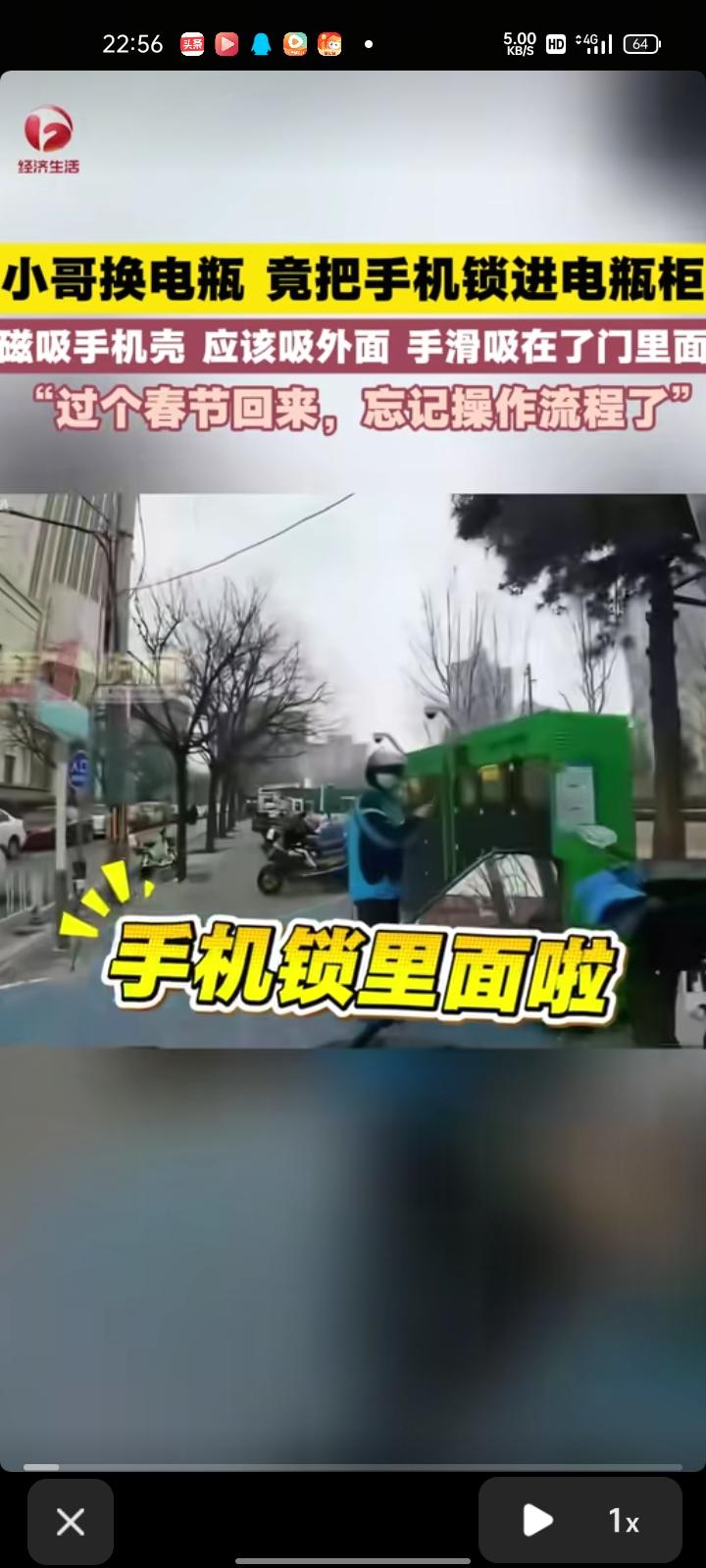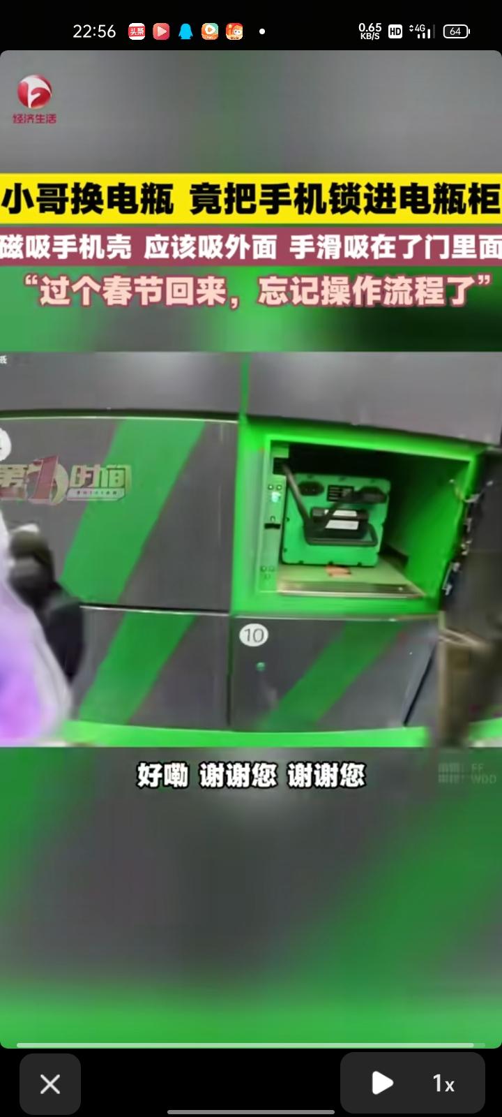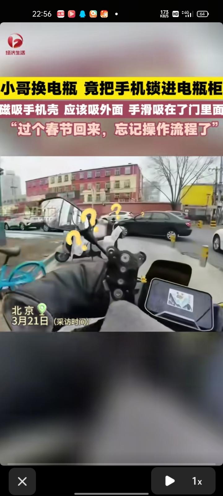 3月15日,北京。网友发视频表示,自己换电瓶竟把手机锁进电瓶柜,电瓶很重,需要两只手才能搬得动,刚好手机壳是磁吸的,扫完码后平时都是吸到外边,过了春节回来忘记了操作流程,手机不小心吸在柜门里边,顺手就给关进去了。最终在客服的电话指导下,终于找到了手机。