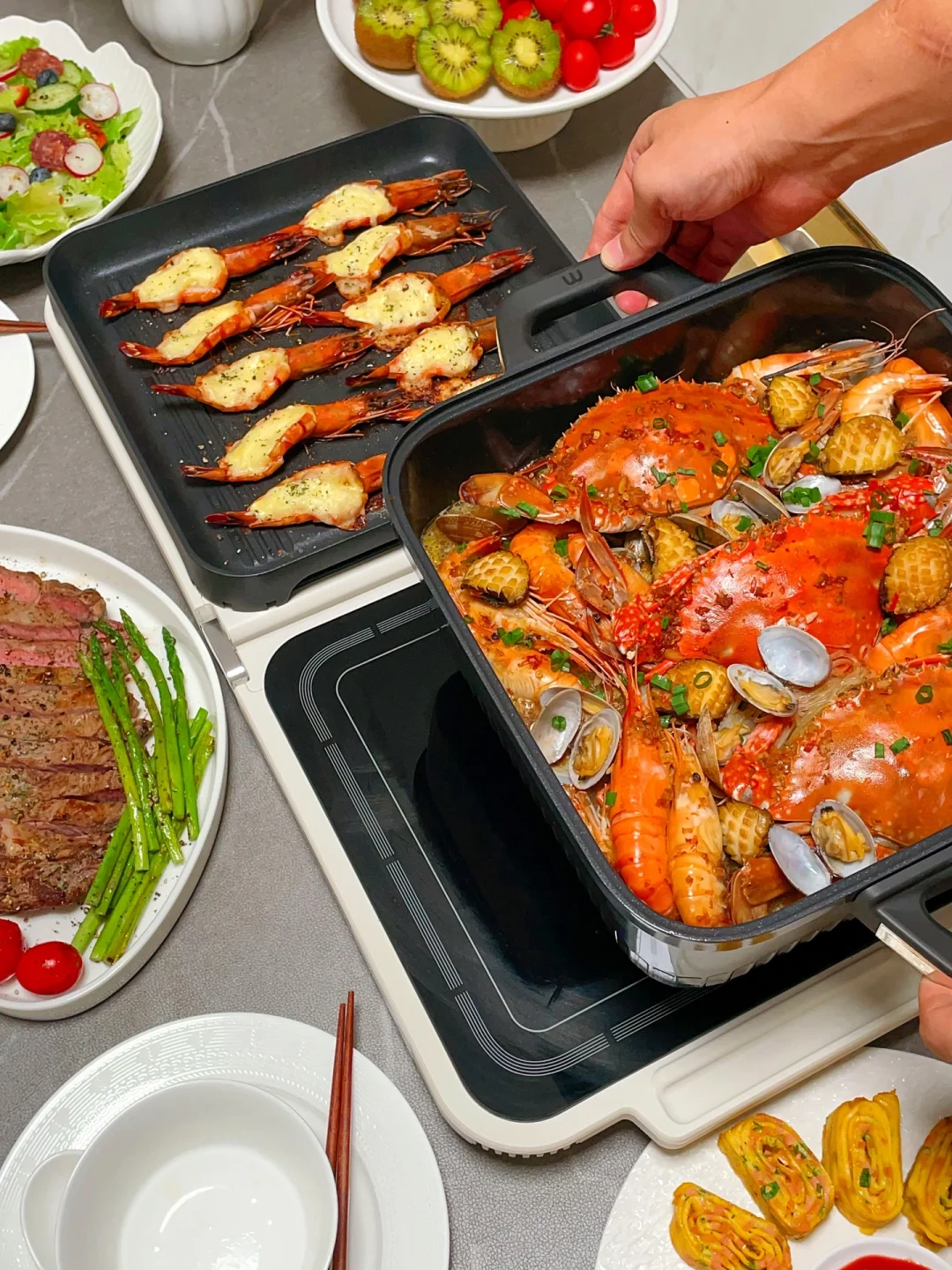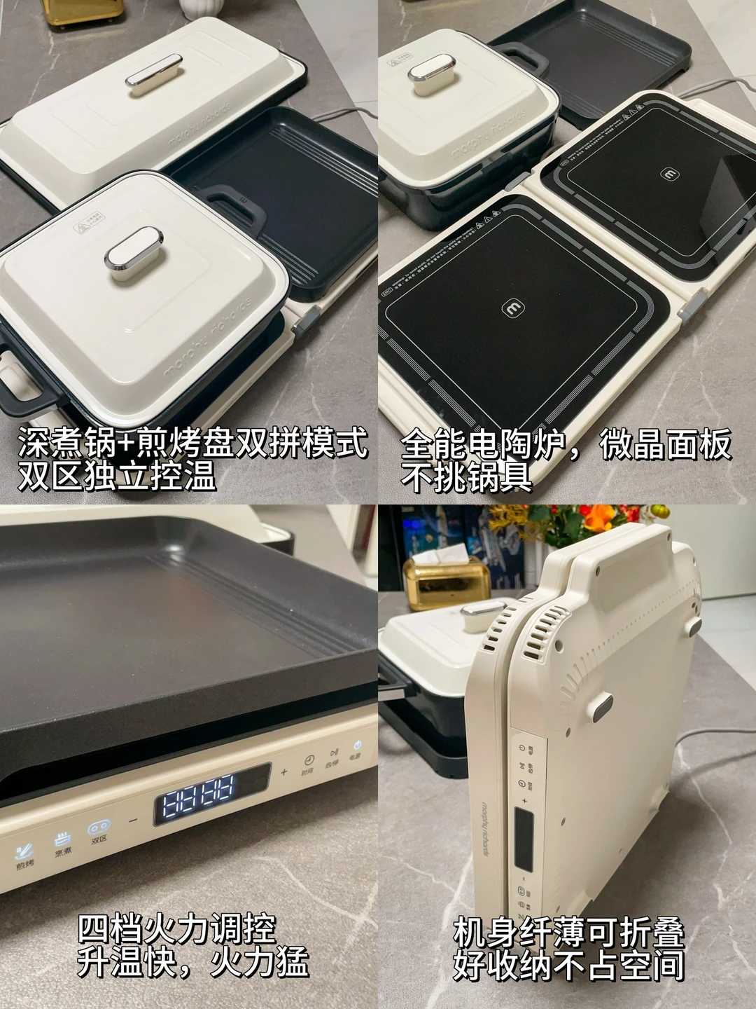 [向右R]一侧是深煮锅一侧是煎烤盘,双拼模式,可以把我俩的需求一次性都满足,真的超爱!两边可以双控同时进行,也可以独立控温,不用担心一边煮的慢或者另一边烧糊的问题。深煮锅容量很大,即便家宴聚餐用也没问题。主机的电陶炉也可以搭配别的锅用,导热很快,2100w快火猛煮,有4档火力可调节。