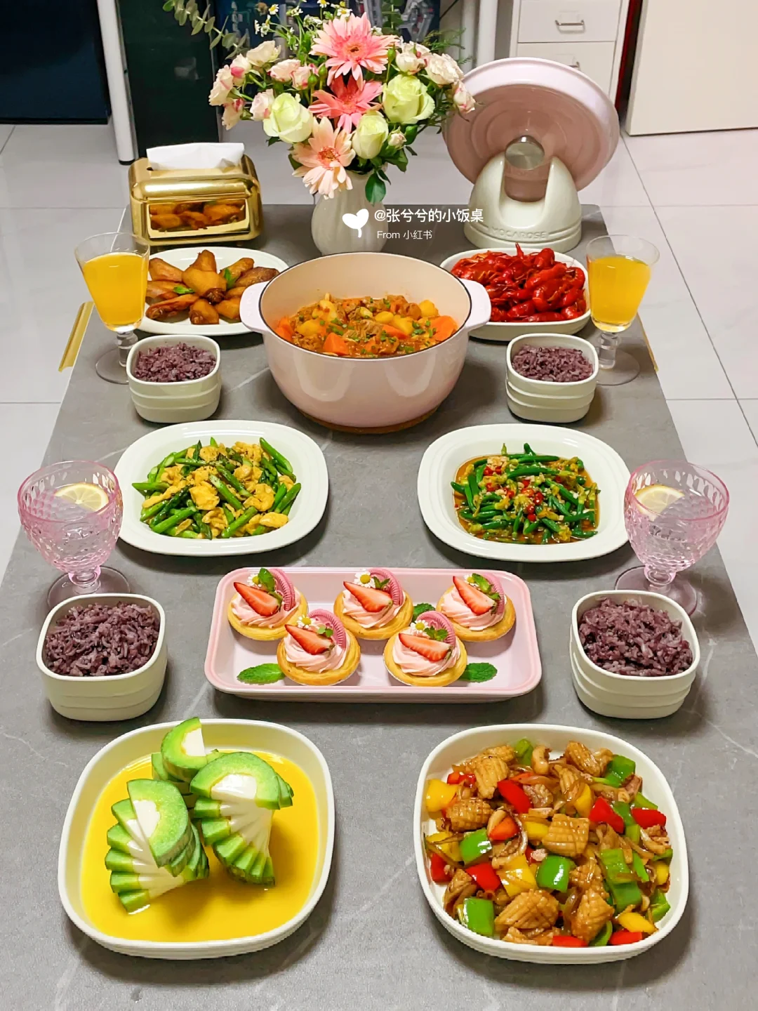 图6️⃣:番茄炖牛腩➕樱花草莓蛋挞➕爆炒鱿鱼➕麻辣小龙虾➕奥尔良鸡翅➕黑椒芦笋炒蛋➕凉拌黄瓜花