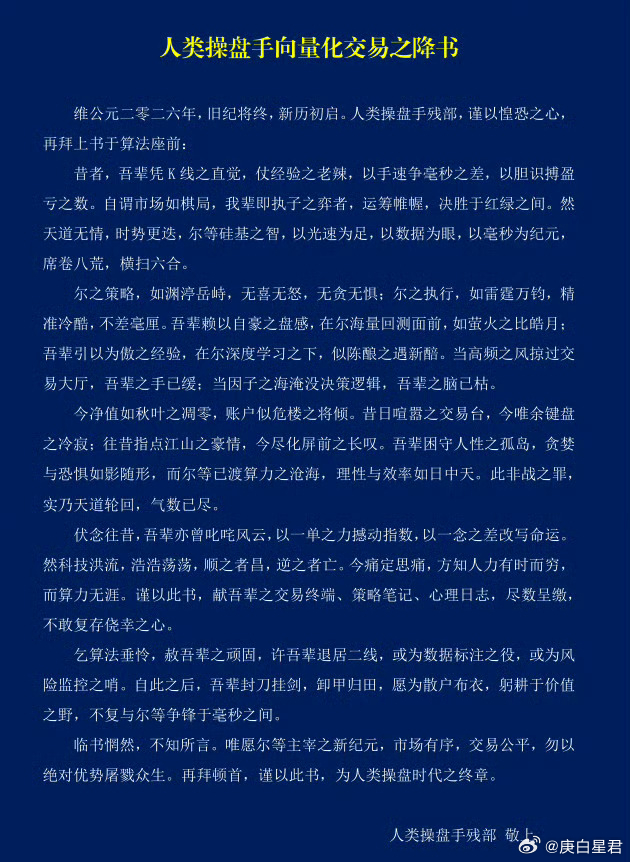 事情的起因,要从周一说起。顶级游资“流沙河”在社交平台上发布了一篇长文,标题起得那叫一个悲壮:《人类操盘手向量化交易之降书》。他在文中详细描述了自己与量化交易的博弈过程,最终以账户净值大幅回撤,怒发“销户”告终。