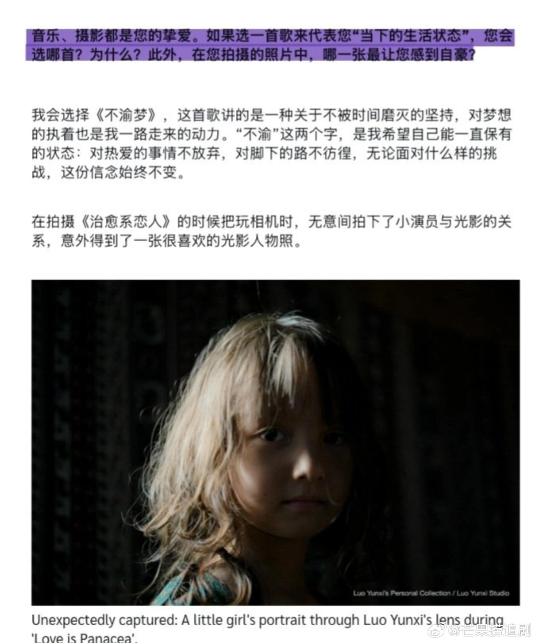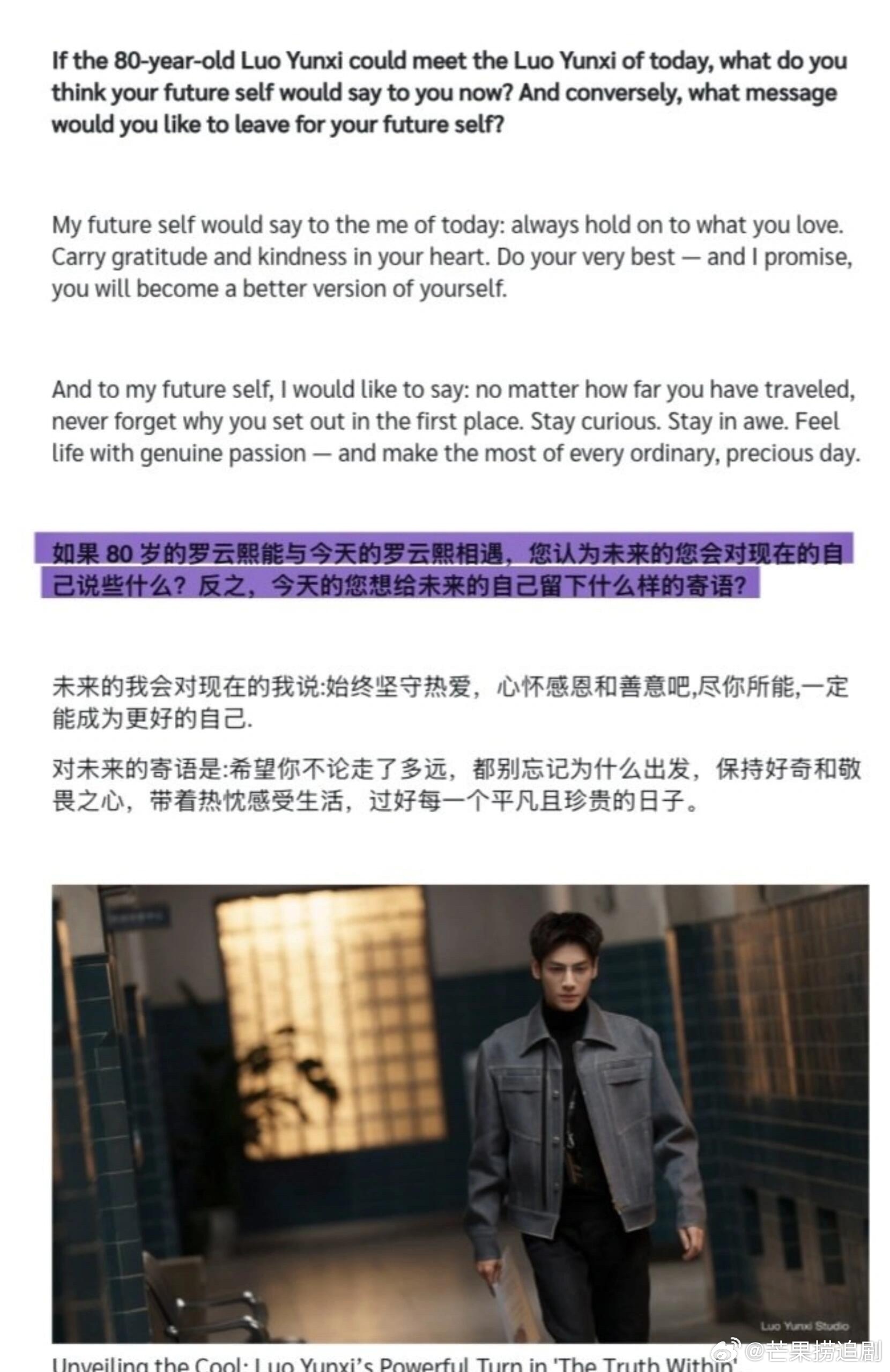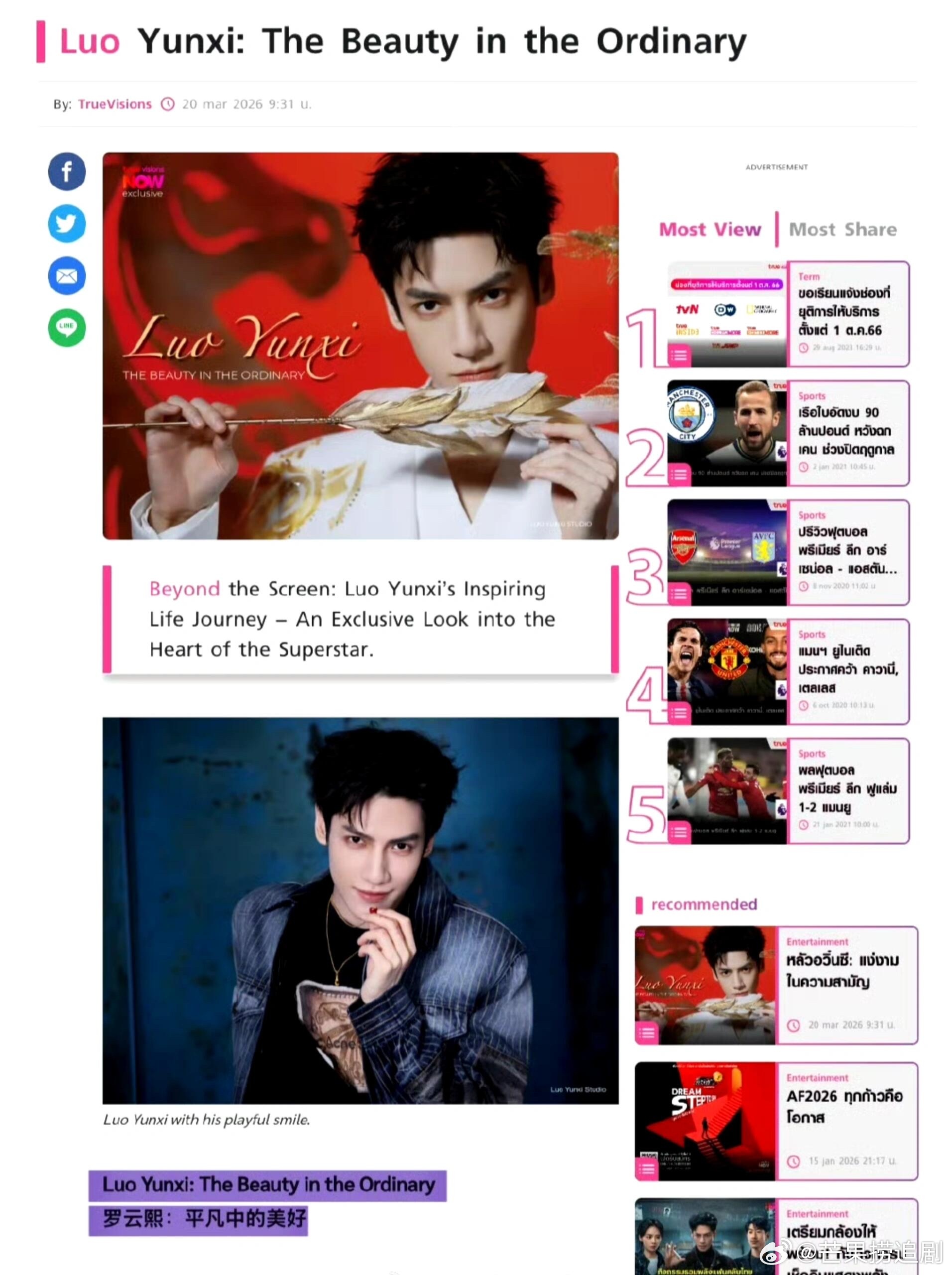 泰媒TrueVisions发表文字专访,盛赞罗云熙是中国当代最出色的演员之一。