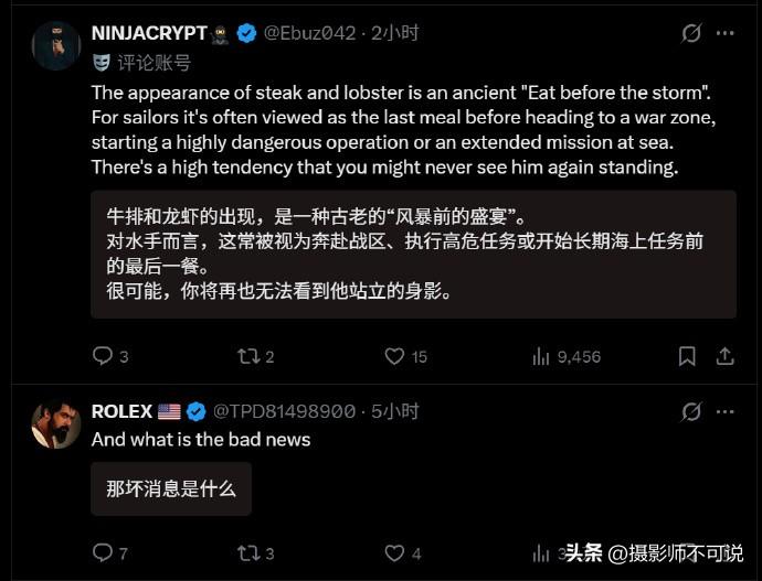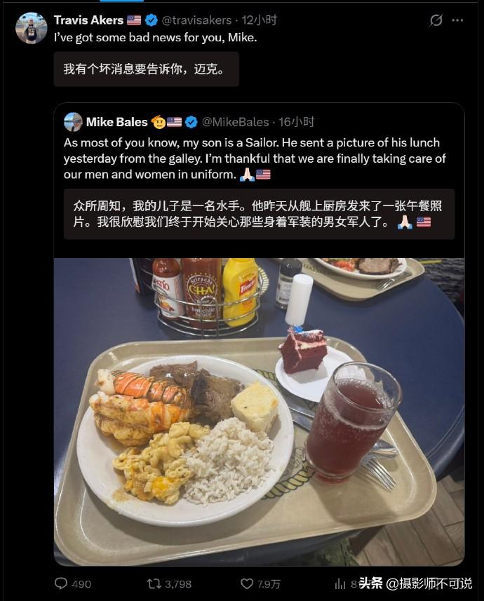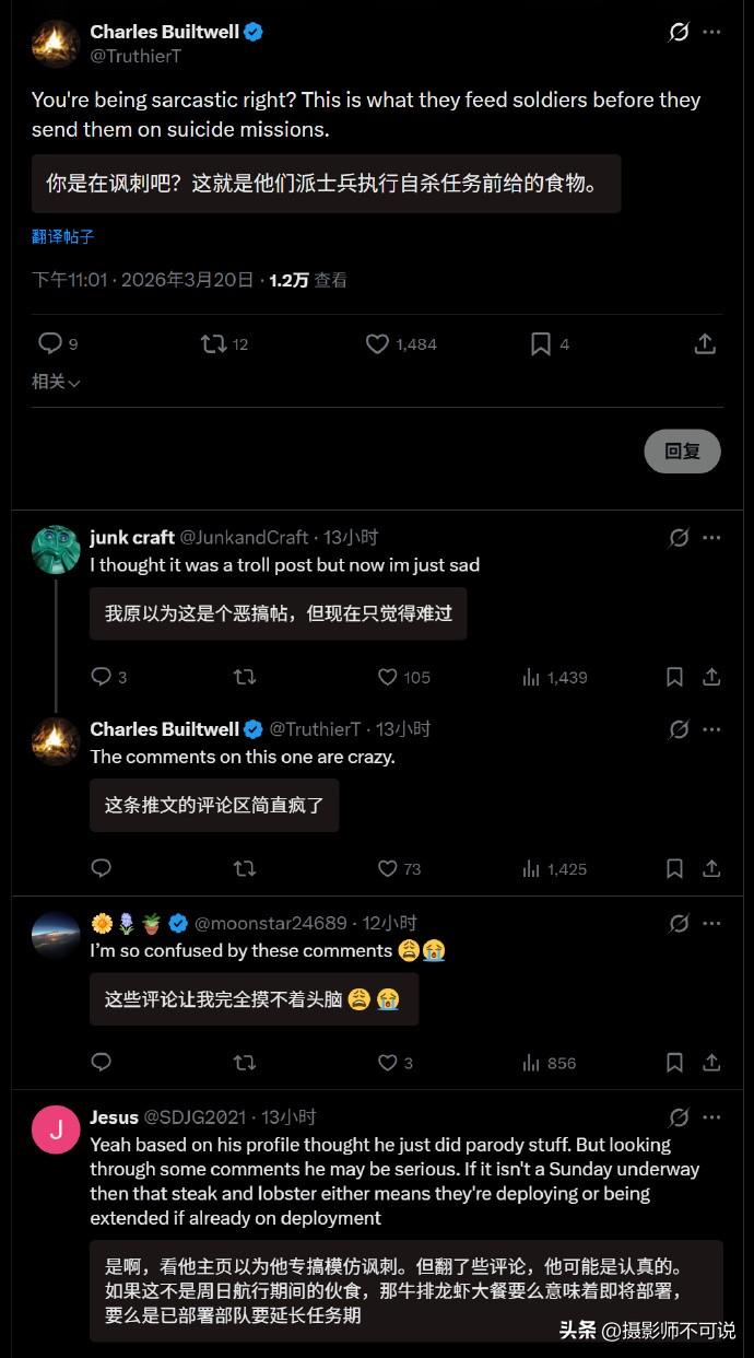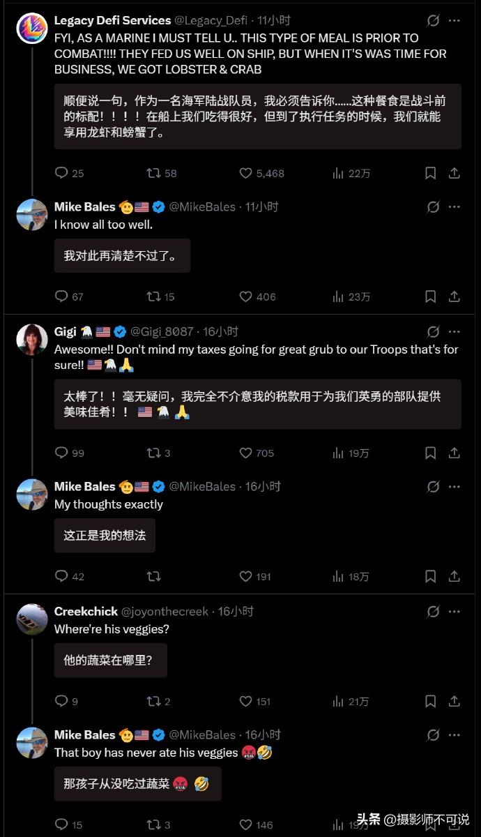 来看看超千万浏览量的帖子长啥样?估计这位天军水兵的老父亲心都碎一地了,本来想炫耀一番儿子的伙食,结果炫出了焦虑不安!事情是这样子的,一美水兵的老父亲拿到儿子拍摄的龙虾尾牛排大餐照片后,就在网上开启了夸赞模式,正当他感觉欣慰时网友们就用无数盆冷水泼了下来。有网友说龙虾牛排大餐是战前餐,意味着他的水兵儿子很快就要奔赴战场了。估计这位老父亲看到这些评论时心都揪起来了吧,这些网友们的做法是几个意思?[捂脸]