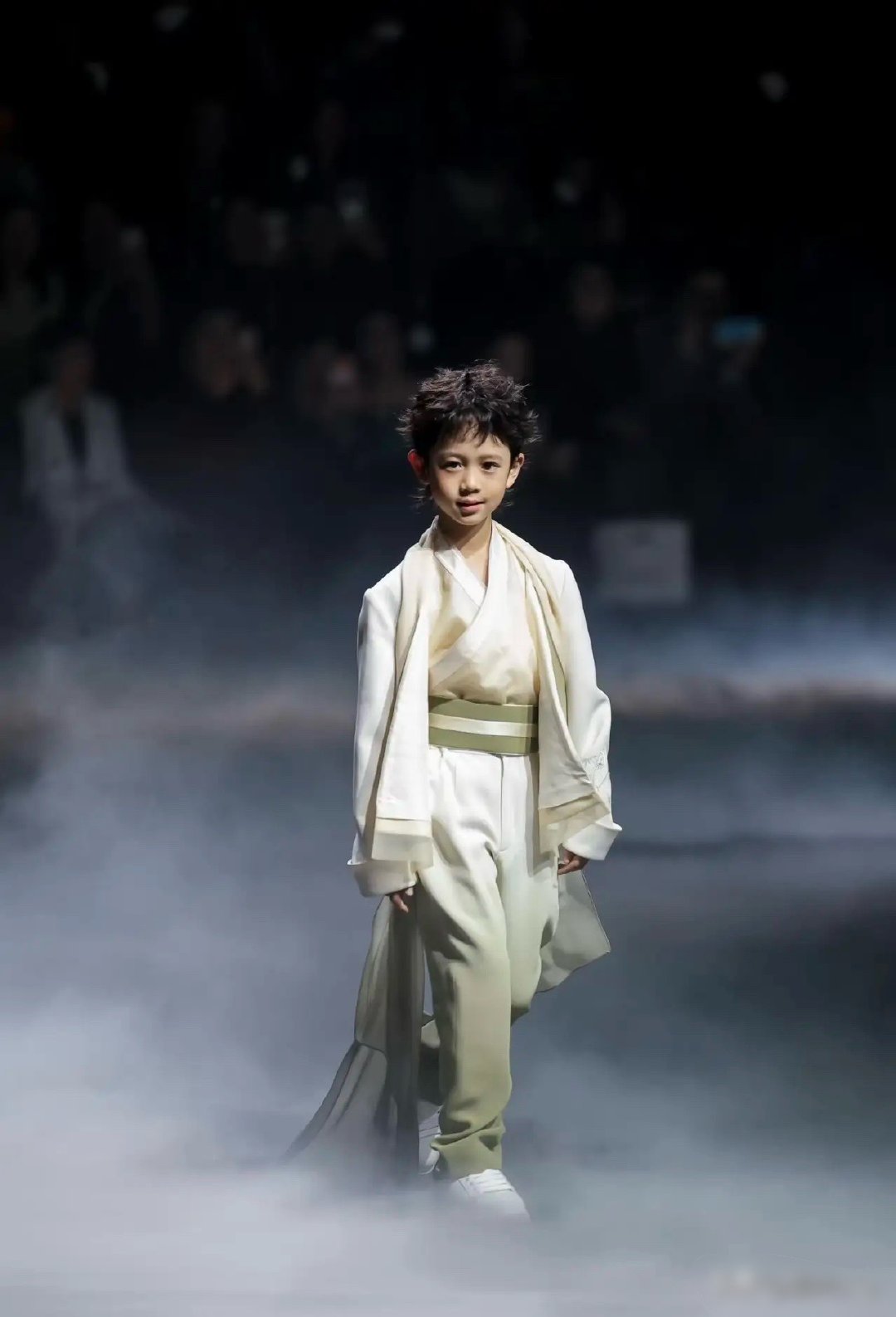 蔡国庆带着儿子庆宝亮相中国国际时装周开幕大秀,庆宝长得好帅,走T台从容自信。庆宝