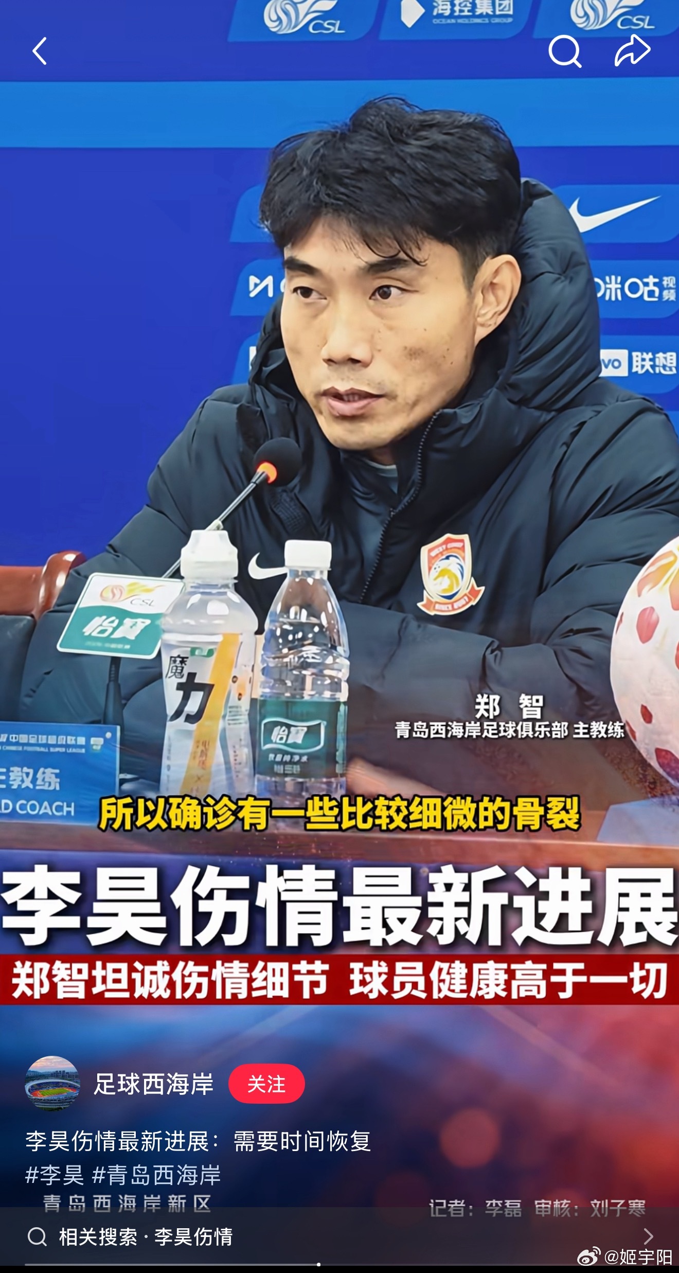 看到西海岸教练郑智赛后的发言,李昊是肋骨有一些比较细微的骨裂。另外,郑智也说和国