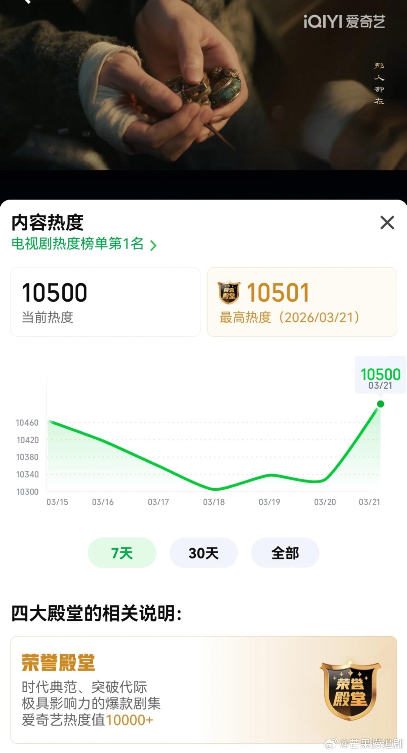 《逐玉》站内热度再创新高,超10500已经加入必看榜前五,目前已经超过之前两人二