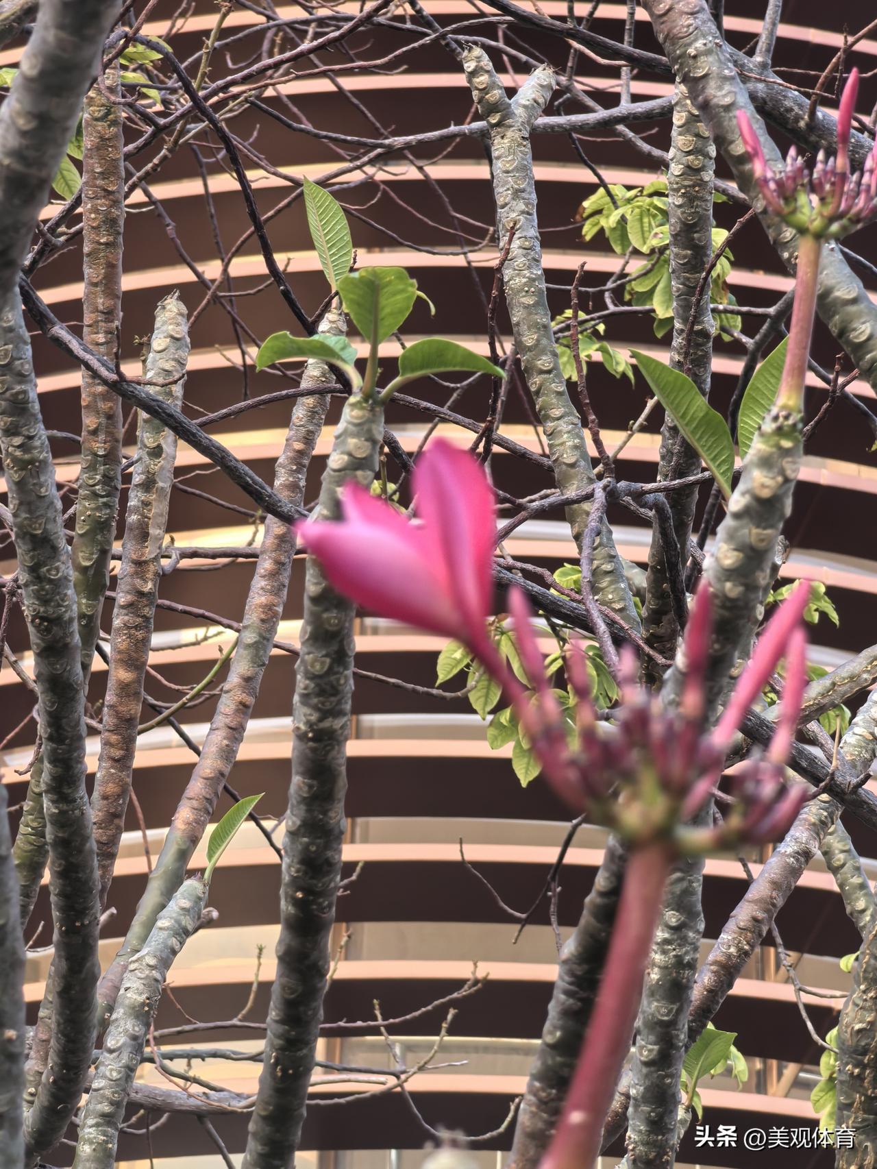 崖州湾千鹤国际交流中心(希尔顿格芮酒店)门前的满深度瀑布水池和鸡蛋花树。