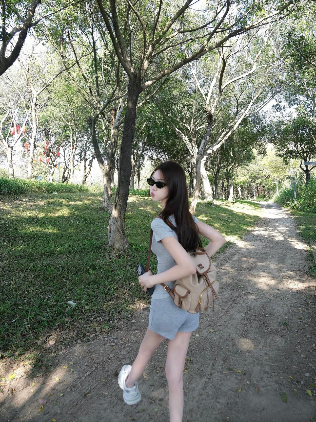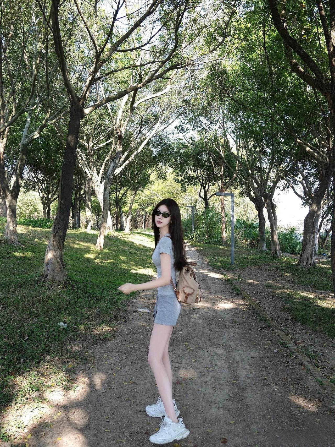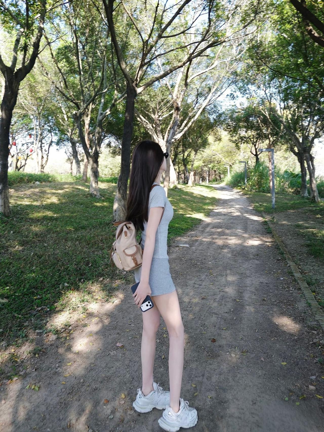 这姑娘在公园里走路真有气质。