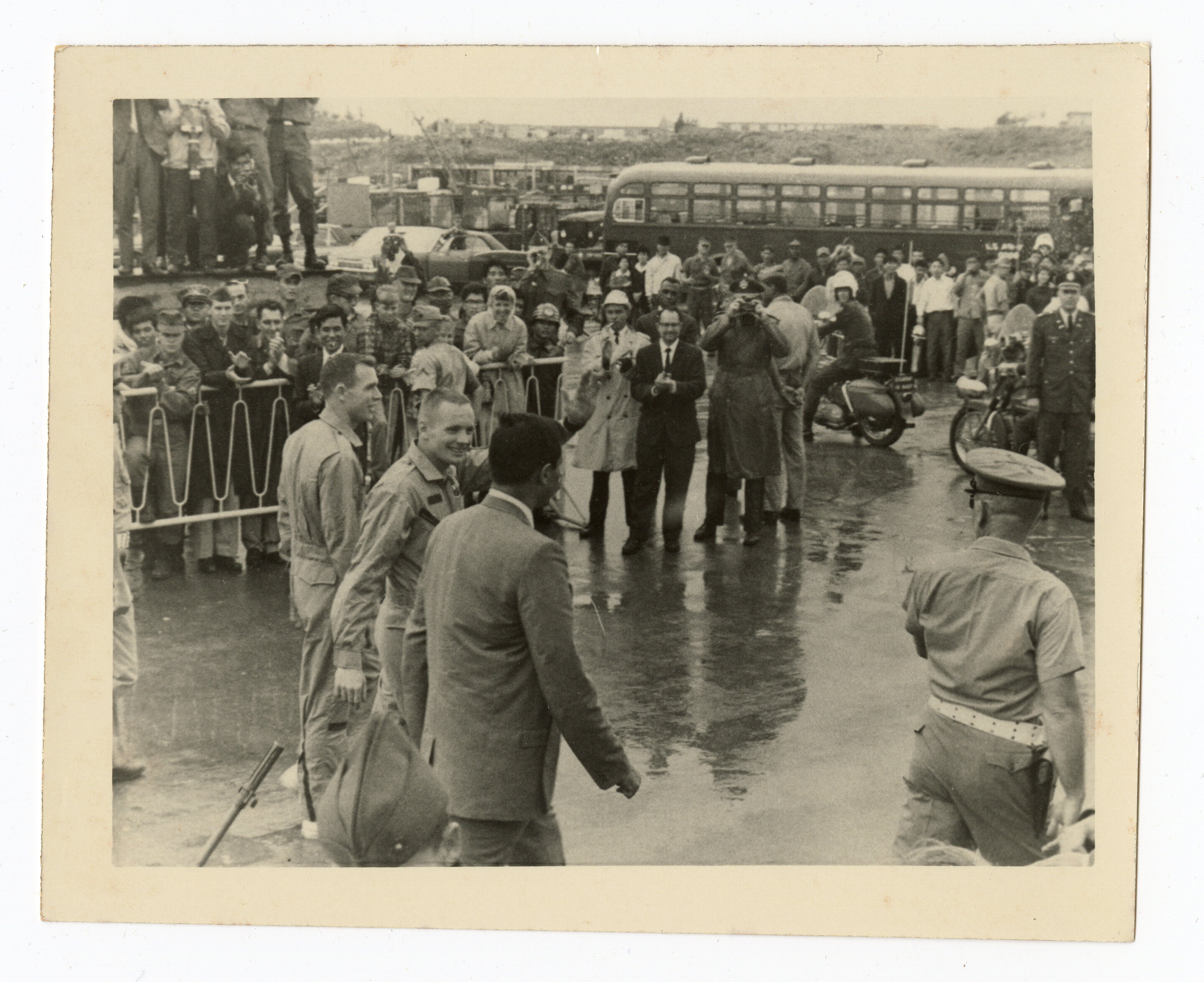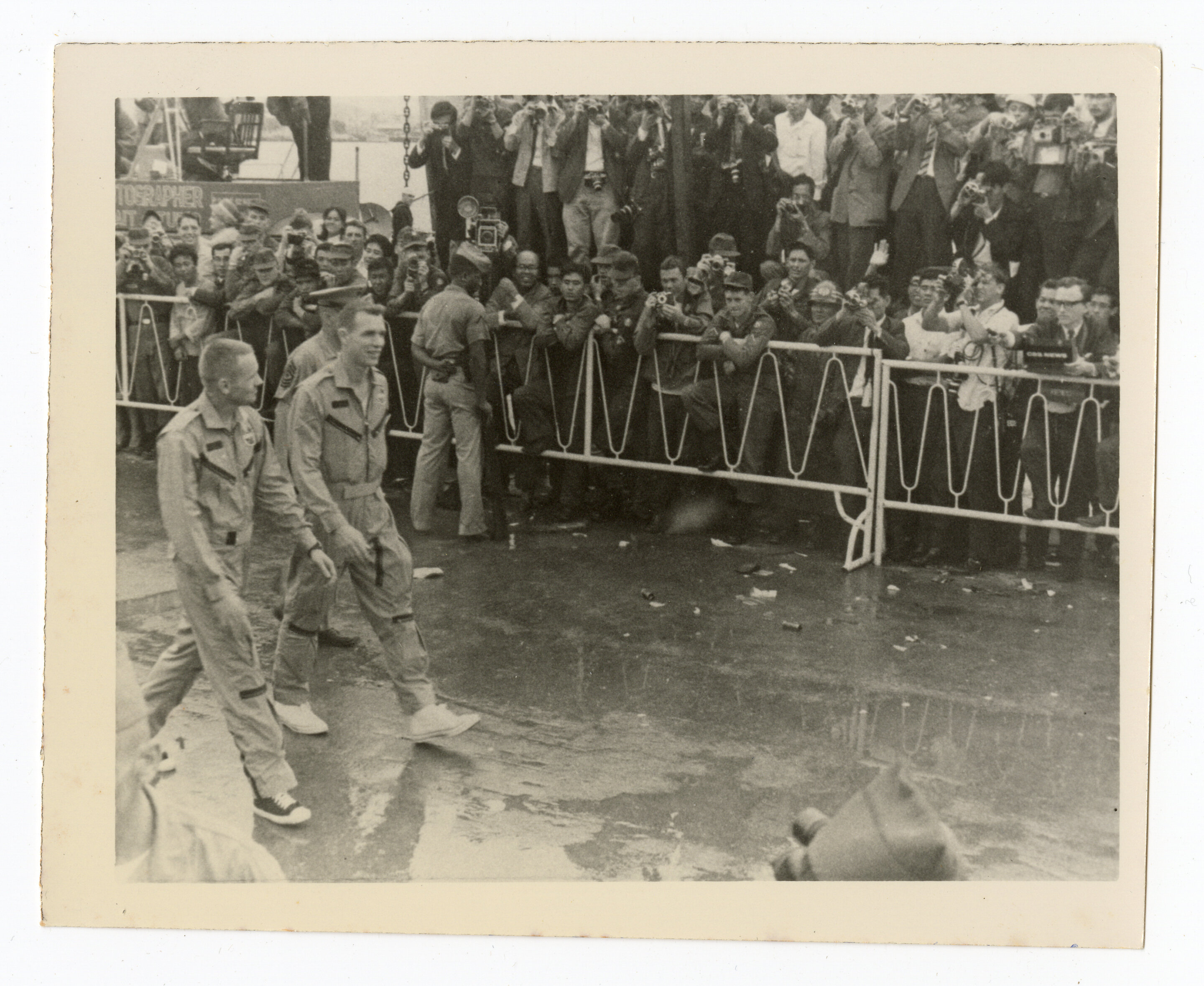 他拍下了他们在驱逐舰甲板上挥手的样子,拍下了他们在冲绳那霸空军基地走过人群的样子,也拍下了双子座8号太空舱被吊起来准备运走的场面。