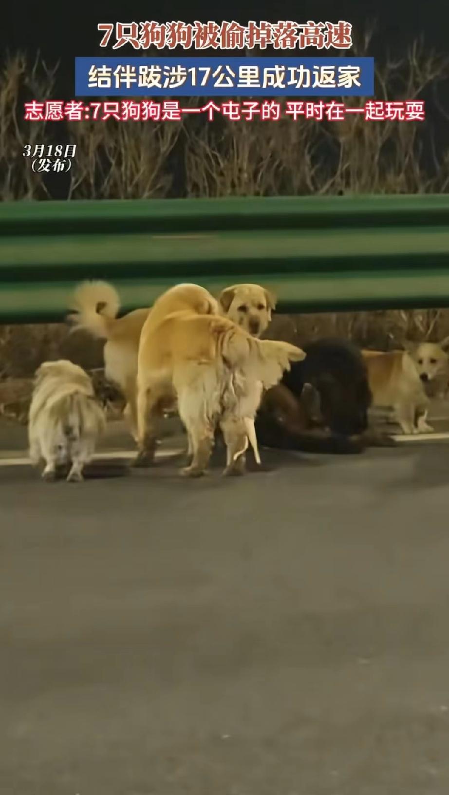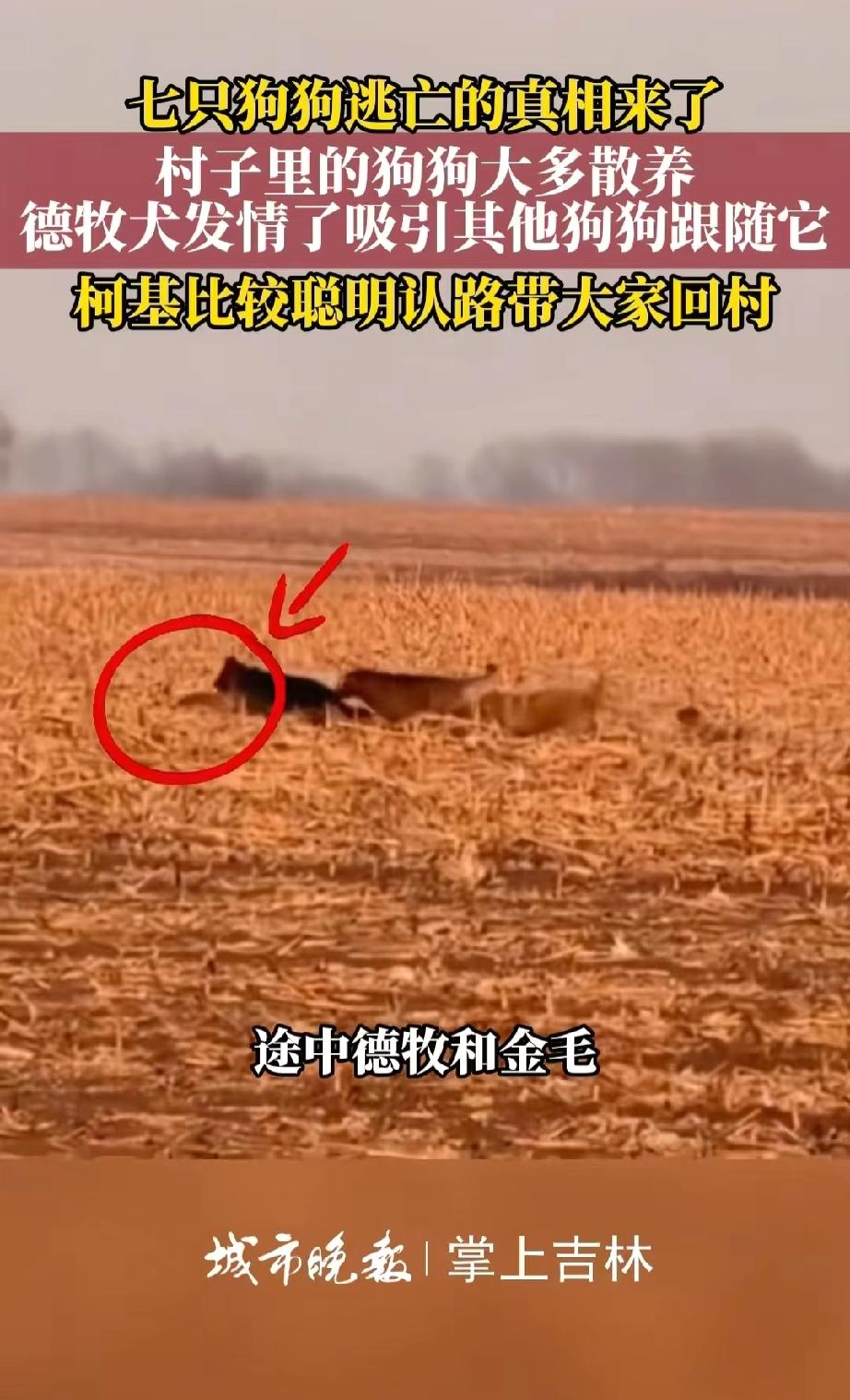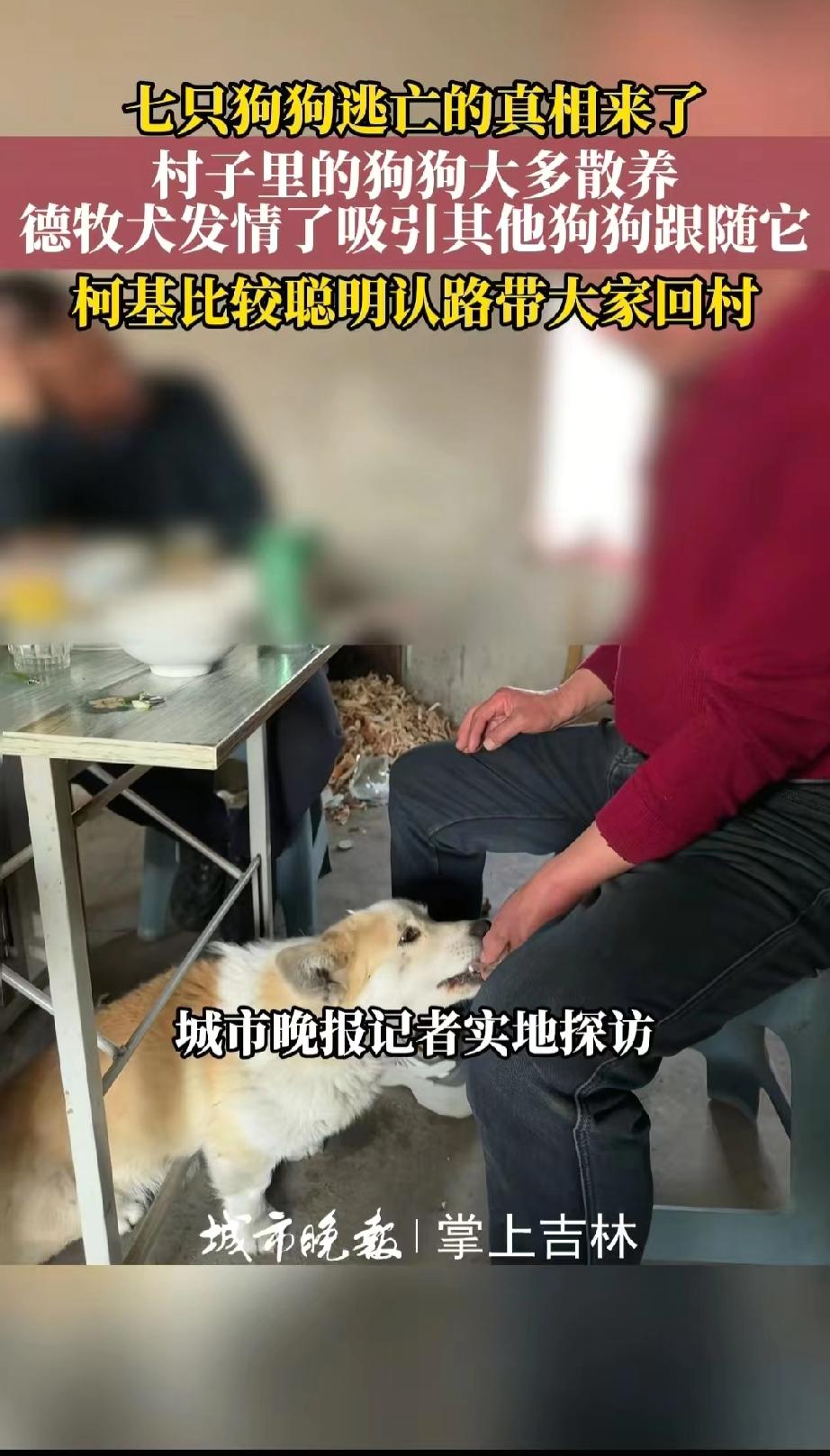 真的是超级大乌龙!这两天一则关于7只狗狗逃亡17公里也要回家的视频,把我一个不养狗的人都看得泪目。 多家媒体报道的内容,标题也很醒目,吉林长春7只狗狗被偷掉落高速,结伴跋涉17公里,成功返家。而且这7只狗狗是一个屯子里的,平时就在一起玩耍。 初看这个新闻,真的让人十分感动。 但是时隔一天之后,经过当地媒体一查,发现这件事情又有了反转。 原来这几只狗都是村里面散养的,平时就喜欢混在一起玩,尤其是那只德牧,正好处于发情阶段,身上的气味,把其他几只狗都吸引过来了,所以其他6只公狗才一路跟着。 这也解释了德牧被围在中间的现象。 至于走在最外面的那只柯基,它则是比较聪明,认识回家的路,所以带领大家回村。 当时还有一个细节,那便是被围在最中间的德牧,走路有点瘸,看着不对劲,大家以为是受了伤。现在一想才恍然大悟,其实这并不是受伤,而是发情期间身体状态有点变化,所以走路有点拖。 不得不说,7个狗的小团队,就是这个柯基聪明,不但认识回家的路,而且还会维持秩序。 所以说这件事情真的是一个超级大乌龙,原来不是狗狗们集体“越狱”逃亡,而是一场与狗狗发情,其他小公狗一路追随的故事。 目前事情也迎来了最终章,这7个小狗的队伍,最聪明的就是柯基,柯基领头带领大家找寻回家的路,途中德牧和金毛,被邻村村民暂时收留,后来主人一一寻回,而且主人很爱自家的小狗,队伍最中央的德牧并没有受伤,到家后,为了避免德牧再次因为发情走丢,暂时已经被拴起来了。而且村里的其他狗狗已经平安到家。 乌龙是乌龙,但是结局是好的! 狗狗们平平安安的回到家里,比什么都好。