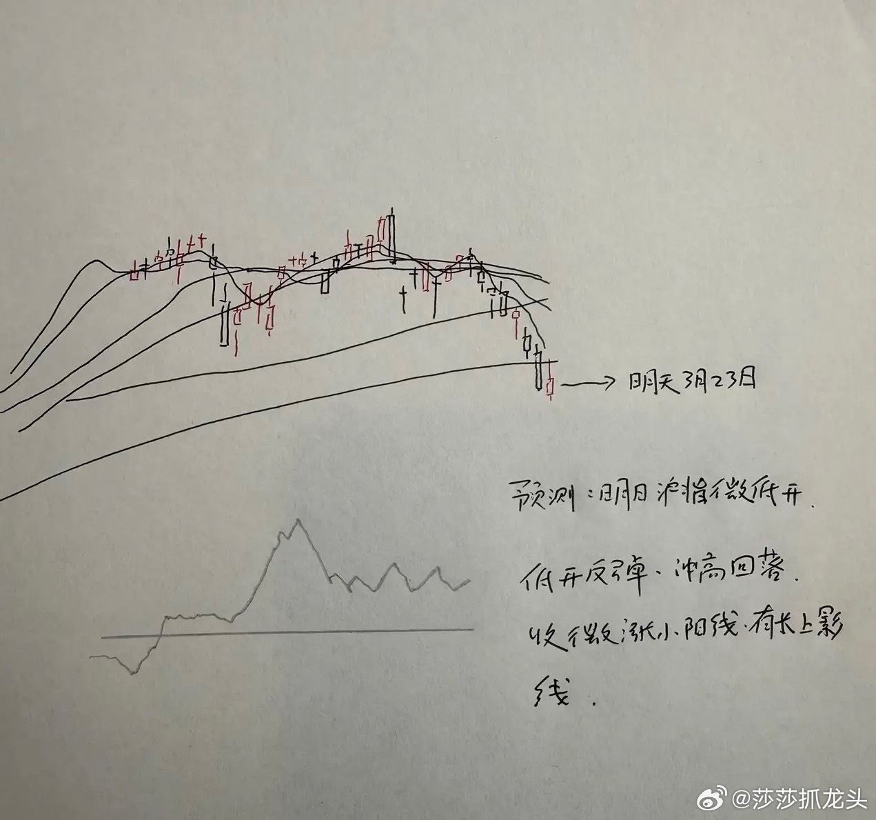 所以综合以上对分析,对于明天市场的走势,莎莎维持相对乐观的判断。虽然周五晚上美股大幅度的调整,但是对于A股来说,我认为明天反弹的概率相对会偏大一些。那么明天A股到底怎么走?大家请看下图——明天走势手绘预测图: