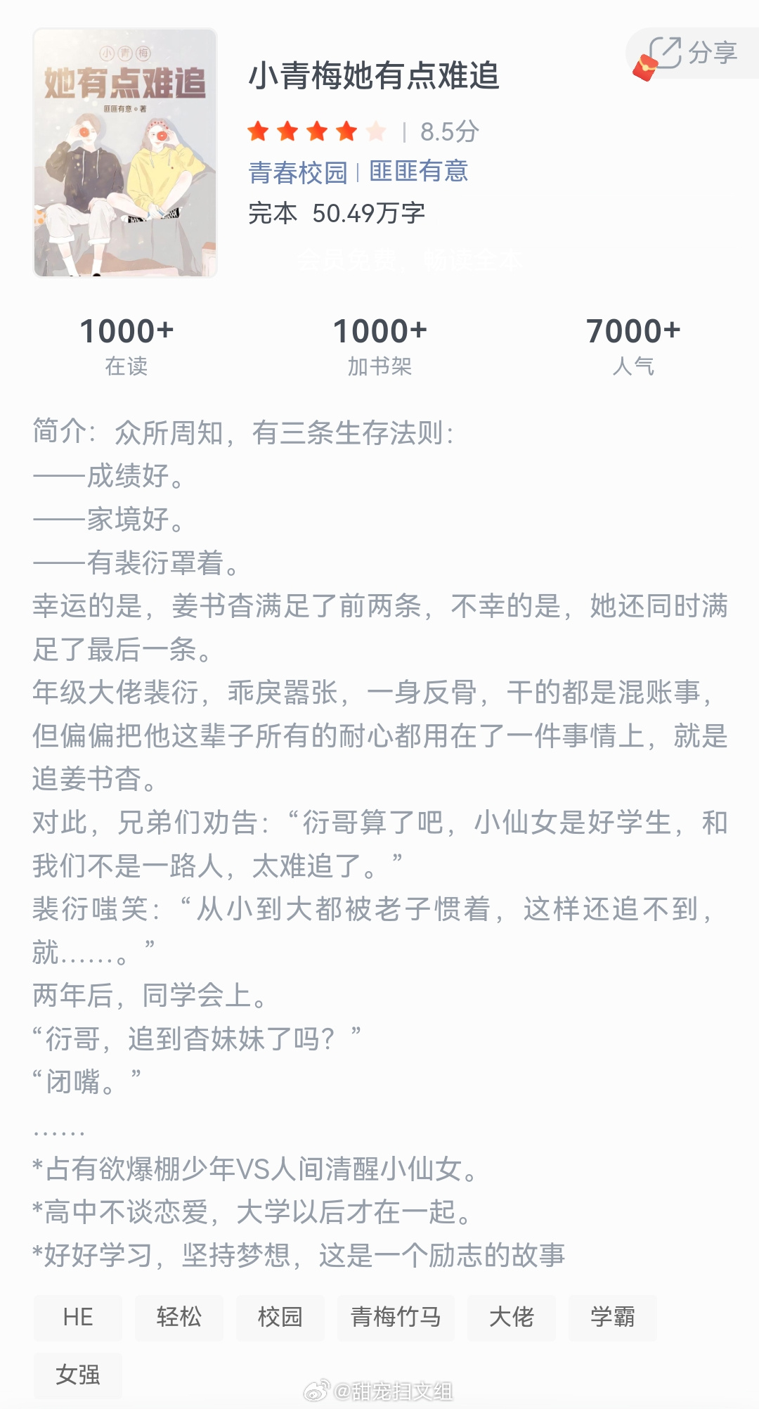 《小青梅她有点难追》作者:匪匪有意众所周知,有三条生存法则:——成绩好。——家境好。——有裴衍罩着。幸运的是,姜书杳满足了前两条,不幸的是,她还同时满足了最后一条。年级大佬裴衍,乖戾嚣张,一身反骨,干的都是混账事,但偏偏把他这辈子所有的耐心都用在了一件事情上,就是追姜书杳。对此,兄弟们劝告:“衍哥算了吧,小仙女是好学生,和我们不是一路人,太难追了。”裴衍嗤笑:“从小到大都被老子惯着,这样还追不到就.....”两年后,同学会上。"衍哥,追到杳妹妹了吗?”"闭嘴。”那些让我着迷的小说 这本小说超绝
