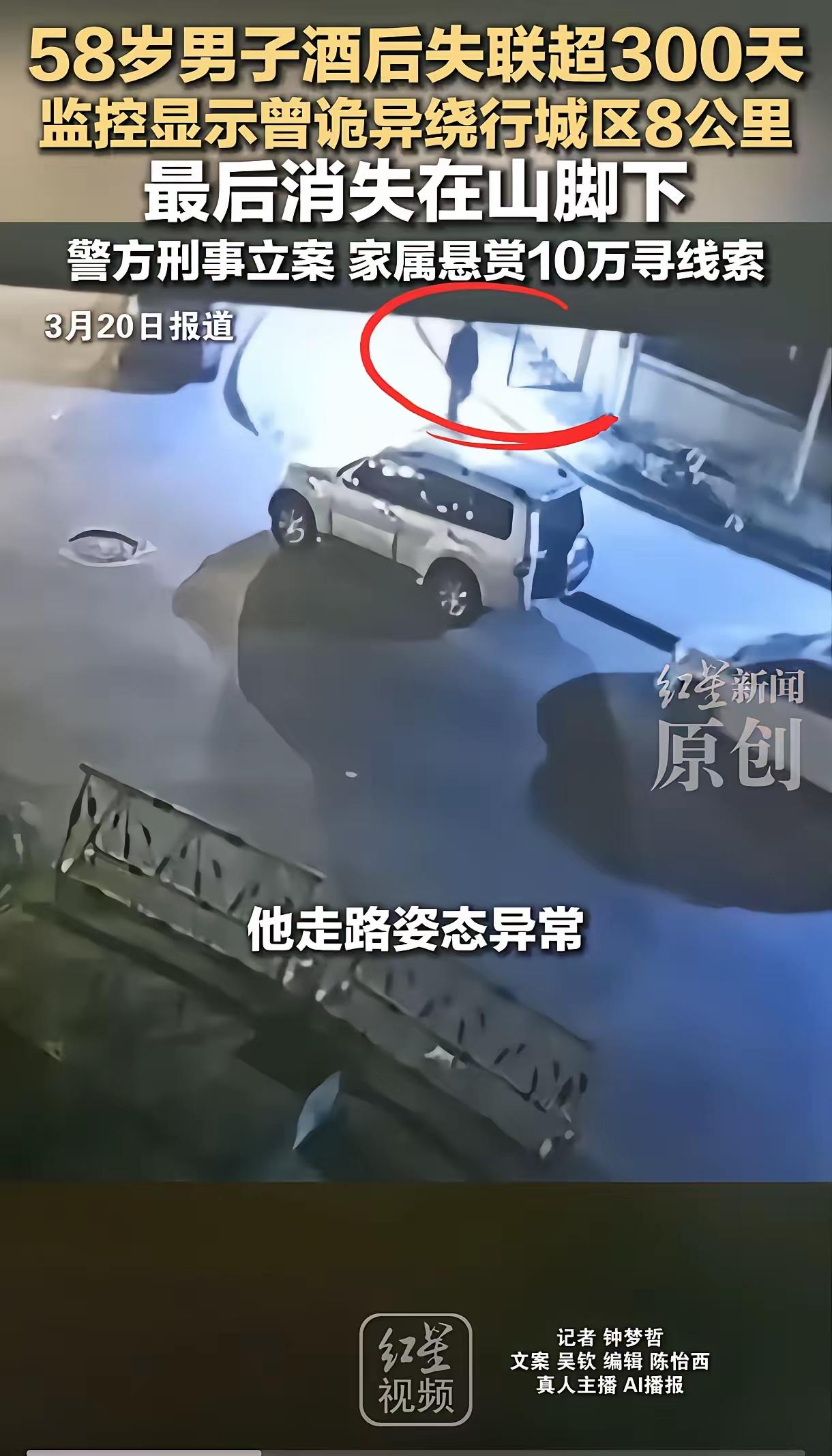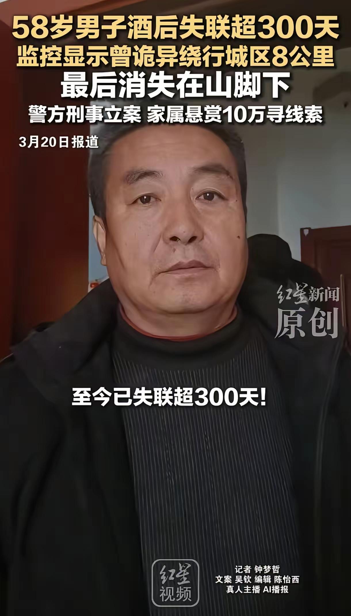 陕西男子聚餐后离奇失踪:一通“没路了”的电话成绝响,千人地毯式搜救近一年竟活不见人死不见尸! (素材来源:红星新闻) “太离奇了!一个大活人,怎么就能在众目睽睽之下凭空蒸发?” 这并非什么悬疑小说的情节,而是真实发生在陕西延安的一起令人毛骨悚然的失踪案。从 2025 年 4 月那个春夜开始,58 岁的校车司机赵永刚,就像是被某种神秘力量吞噬了一般,整整消失了 300 多天。警方出动上千人力、无人机、搜救犬,将山林翻了个底朝天,却依旧“生不见人,死不见尸”。这背后,究竟隐藏着怎样的真相? 酒局后的诡异转折:从“半斤白酒”到“反向狂奔”! 时间回溯到 2025 年 4 月 3 日晚 22:50 分,延安人民广场附近的一家餐馆内灯火通明。58 岁的赵永刚刚刚结束了一场愉快的同事聚会。老赵是个出了名的热心肠,性格开朗,身体硬朗,平时有一斤左右的酒量,在单位口碑极佳。当晚,他喝了半斤白酒,对于他来说,这本是微醺的状态。然而,反常的一幕发生了:从不抽烟的老赵,竟然接连抽了五支烟。 这一细节被身边的同事敏锐地捕捉到了。出于关心,一位同事提议去趟厕所,回来便送老赵回家。可谁能想到,就是这短短几分钟的间隙,成了生与死的分水岭。当同事返回餐厅门口时,原本在那等候的老赵已无影无踪。电话无人接听,询问周遭也无人见过他离开。一种不祥的预感瞬间笼罩了在场所有人。 监控下的“鬼魅”轨迹:八公里迷途与最后的绝响。 警方迅速介入,调取了周边所有监控。画面中的老赵,状态极度异常。他没有走向回家的方向,反而朝着相反的道路独自步行。脚步虚浮、摇摇晃晃,神情恍惚得仿佛换了一个人。明明只喝了半斤酒,他却表现得如同烂醉如泥。 监控记录了他最后几个小时的诡异行程:他一路经过山脚学校、宝塔区第四中学,时而前行,时而折返,像是在迷宫中打转。整整 8 公里的路程,他走了好几个小时,直到凌晨 1:25 分,身影消失在一处上山路口——那里,是监控的盲区。 就在大家以为线索彻底中断时,凌晨 2:00,老赵的儿子接到了一通令人心碎又惊喜的电话。电话那头,老赵的声音有些飘忽:“我在山坡上了。”儿子激动地让父亲原地等待,马上就去接他。然而,下一秒,听筒里传来的却是老赵疑惑且惊恐的一句话:“咦,怎么没路了?” 话音未落,电话戛然而止。再回拨,已是无法接通;到了凌晨 3 点,手机彻底关机。这句“没路了”,竟成了老赵留给世界的最后一句话,也成了悬在所有人心头的最大谜团。 千人地毯式搜救:悬赏十万仍无果,大山深处藏着什么? 案件迅速升级为刑事案件,专案组正式成立。一场史无前例的大规模搜救随即展开。民警、特警、消防、红十字会,加上上千名热心市民,组成了庞大的搜寻队伍。无人机在空中盘旋,搜救犬在林间穿梭,人们拿着手电筒,恨不得把太清山周边的每一寸土地都翻过来。 涵洞、灌木丛、悬崖峭壁……搜救持续了数月,覆盖了所有可能的角落。家人更是心急如焚,不仅自费购买专业寻人设备,还将悬赏金从 5 万一路加码到 10 万,承诺只要提供有效线索当场兑现。然而,奇迹并没有发生。将近一年过去了,老赵就像人间蒸发了一样,没有任何踪迹。 三大不可能与唯一推测:是意外还是谜团? 面对如此诡异的失踪,网友们议论纷纷,但理性分析下来,几种常见猜测似乎都被排除了。 首先,绝不可能是离家出走。老赵家庭和睦,工作稳定,无外债无矛盾,没有任何动机抛妻弃子躲藏一年。 其次,排除他杀可能。警方经过详细勘查,明确表示现场无打斗痕迹,若是凶杀,在如此大规模的搜山下,不可能连一点衣物碎片或血迹都找不到。 最后,车祸拖走也不成立。沿途监控密集,若被车撞后拖入山林,很难做到全程无痕清除。 那么,真相究竟是什么?结合老赵酒后意识模糊、路线反常以及那句“没路了”的遗言,最合乎逻辑的推测指向了失足坠崖。 山区地形复杂,夜晚视线极差。老赵当时判断力严重下降,误入歧途走到悬崖边或陡坡处,一脚踩空滑落深谷或掉入隐蔽的溶洞、缝隙中,这种可能性最大。一旦落入人迹罕至的深层植被或地下暗河,即便动用高科技设备,寻找难度也堪比大海捞针。 据悉,今年 3 月 25 日,搜救队将再次启动新一轮搜寻。我们期盼着,在这片沉默的大山深处,能早日传来老赵的消息,无论生死,都要给家人一个交代。这起离奇失踪案,不仅是一个家庭的悲剧,更是对大自然未知力量的一次深刻警示:人生无常,敬畏自然,切莫在神志不清时涉足险地。男童走失踪 陕西男子失踪