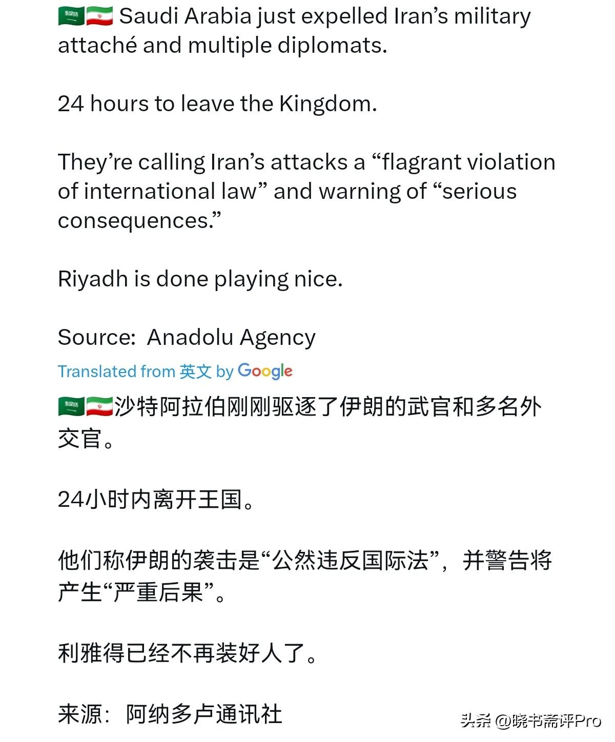 事情严重了!沙特已经与伊朗中断军事外交关系!3月22日,根据外媒报道,沙特阿拉伯外交部21日晚发表声明说,沙特方面已通知伊朗驻沙特大使馆武官、武官助理以及另外3名使团成员为“不受欢迎的人”,要求他们在24小时内离开沙特。沙特警告称,沙特谴责伊朗对沙特等地区国家的袭击,将毫不犹豫地采取一切必要措施,维护主权,保障国家安全。 很显然,沙特这一动作极为严重,这意味着什么呢?这意味着沙伊关系已经从口头警告升级为实质性外交断腕。事实上,武官是两国军事合作、情报沟通、危机管控的关键桥梁。驱逐武官并限制24小时离境,等于军事层面彻底断联、互信归零。这当然不是小摩擦,而是摊牌。 如果说此前沙特与伊朗恢复了信任,那么随着本次冲突越来越升级,沙特与伊朗的关系将重回敌国状态。由于沙特是逊尼派国家的老大,沙特作出驱逐动作之后,其它海湾国家极有可能跟进。而下一步,沙特极有可能反击,攻击伊朗境内目标,事态远比外界想象得更加危险。 而事实上,就在此前沙特同意美国使用境内空军基地与领空,而伊朗则强硬警告沙特称,沙特全境能源设施、军事基地列为合法打击目标,誓言让沙特为“引狼入室”付出代价。因此,这一次冲突极有可能从美以与伊朗的战争,变成中东国家联合美以针对伊朗的军事行动。