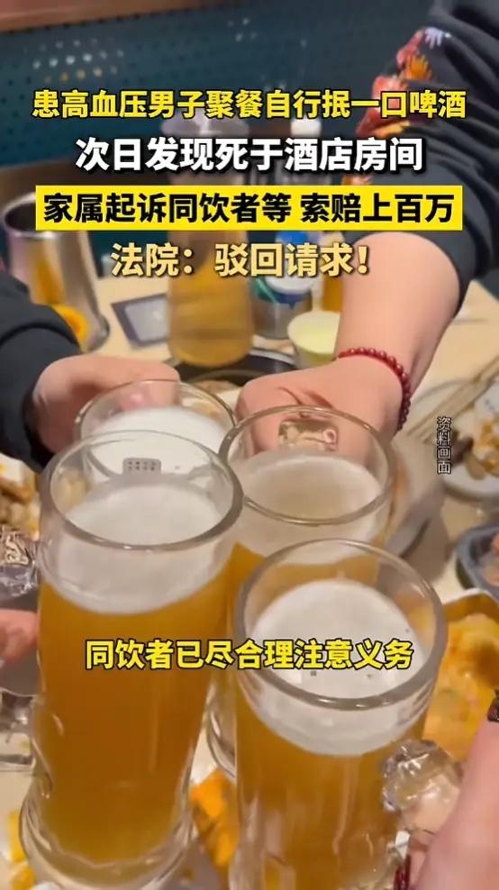 “冤不冤?”2023年5月,陕西,一男子去外地公司谈项目,饭局上说自己有高血压不能喝酒,别人也没劝,可散场前男子自己抿了口啤酒,表示感谢,结果第二天被发现倒地不起,最后身亡,家属把3名同饮者和该公司告上法院,索赔143万余元!法院判了! 这事儿发生在陕西富平。老吴那天去一家公司谈合作,对方挺热情,中午安排吃饭,下午陪着考察,晚上又张罗了一桌。连上客户和员工,一共九个人。 开席前,老吴特意跟公司老板打了招呼。他说自己有高血压,医生叮嘱不能喝酒。老板一听,立马点头说行,那咱们今天就不喝酒,以茶代酒。老板就没带酒上桌。 饭桌上有个工程师嘴馋,自己点了三瓶啤酒。三四个人分着喝,最后也没喝完。整个过程,没人给老吴倒酒,更没人劝他喝。大家都记着他有高血压这茬儿。 眼看饭局快散了,老吴可能觉得过意不去。他主动拿起酒瓶,往自己那个小玻璃杯里倒了大概三分之一的啤酒。端着杯子跟大家示意了一下,然后抿了一口。真的就是润了润嘴唇那种。 晚上八点,公司的人把老吴安安稳稳送回了酒店。当时人好好的,没什么异常。谁能想到,第二天下午一点多,酒店服务员去查房,发现老吴直挺挺躺在地上。 120赶来抢救,已经来不及了。医院开的死亡证明上写着:呼吸心跳骤停。人就这么走了,才五十出头。家属悲痛欲绝,可接下来的操作,让很多人坐不住了。 家属一纸诉状,把同桌喝酒的三个人和那家公司全告了。张嘴就要赔偿143万多!理由是明知道老吴有高血压还让他喝酒,没尽到安全保障义务。 法院审理后给出三点:第一,没人劝酒,酒是老吴自己主动喝的。全程没人给他倒酒,没人劝他喝,他自己主动倒酒抿的那一口。 第二,当天晚上八点,公司的人把老吴安全送回酒店休息,当时人没有任何异常。从法律上讲,共同饮酒者的安全保障义务,主要体现在“不强迫劝酒”和“安全护送”这两点上。 第三,医院死亡证明写的是呼吸心跳骤停,没有证据证明这一口啤酒直接导致了死亡。家属自己也不同意做尸检,无法确定具体死因。 法院最终驳回了全部诉讼请求,一分钱都没判赔。这个判决出来,有人拍手叫好,说法院终于硬气了一回。有人后背发凉,说以后请朋友吃饭,到底还敢不敢上酒? 老吴的遭遇让人同情。可冷静想想,同桌的人真的做错了吗?他们没劝酒,没灌酒,还安全把人送回了酒店。一个成年人,明知自己有高血压,主动喝了那口酒,后果该谁承担? 成年人要为自己的行为负责,不能一出事就找别人赔。同桌饮酒者的责任是有限的,不是无限的。他们只需要做到不劝酒和安全护送,就算尽到了义务。 老吴的离世是个悲剧,把责任全推给同桌的人不公平。每个人都要对自己的健康负责,明知身体不行,那一口酒就不该喝。商务应酬,心意到了就行,没必要用健康冒险。 酒桌文化该改改了,健康比面子重要。也希望类似的悲剧不再发生,大家都能平平安安吃饭,高高兴兴回家。 各位读者你们怎么看?欢迎在评论区讨论。
