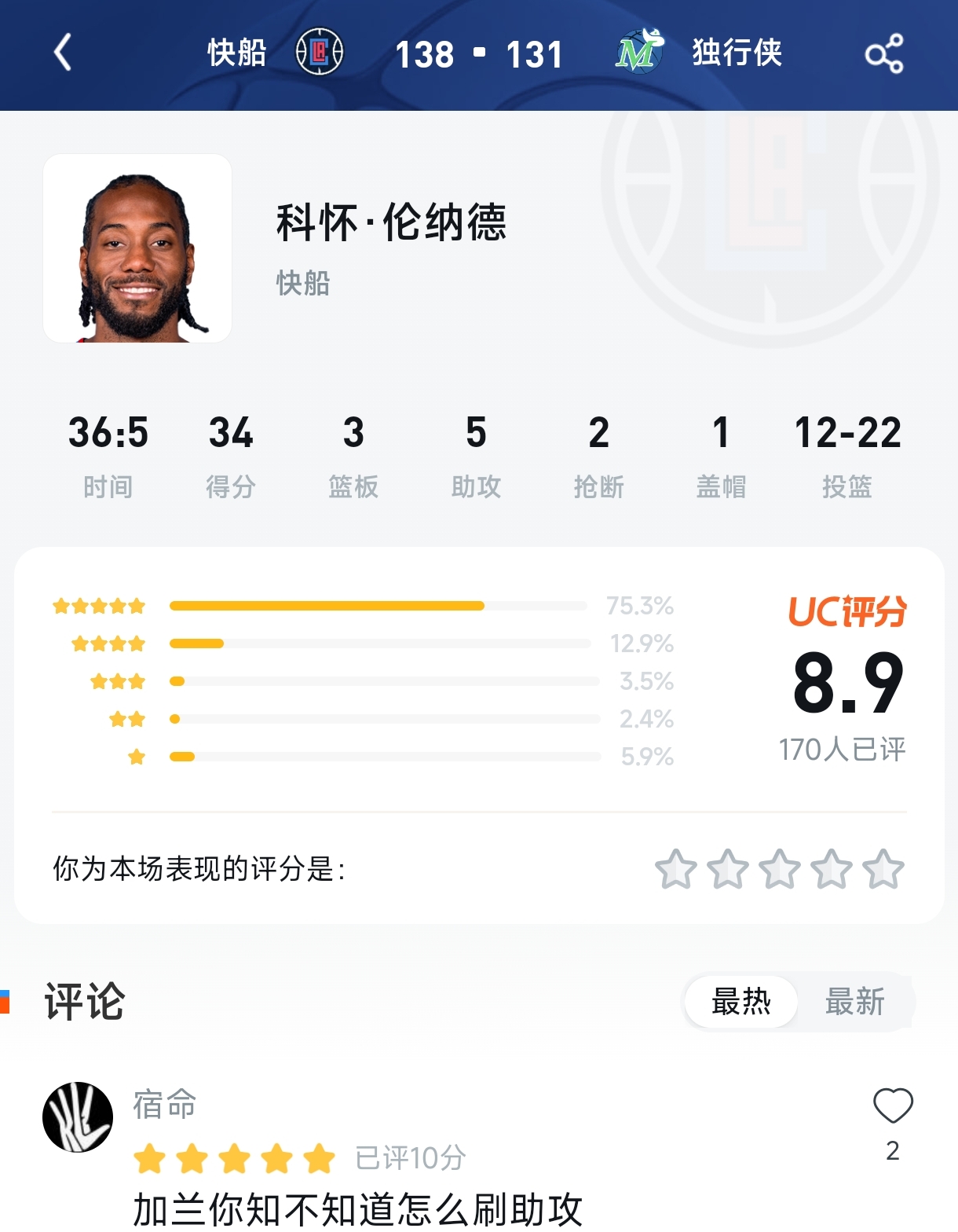 一场加时鏖战,快船终于止住四连败的颓势。138-131,这个比分背后是伦纳德又一次的“常规操作”,也是评分区里那些让人忍俊不禁的神评论。 北京时间3月22日,NBA常规赛上演了一场西部卡位战,洛杉矶快船客场历经加时以138-131击败达拉斯独行侠。这场比赛打得跌宕起伏——快船首节一度落后10分,末节又被独行侠逼入绝境,直到加时赛才一波流带走胜利。 而赛后,伦纳德的UC评分区里,8.9分的高分背后,藏着球迷们复杂的心情。 ① 原始评分截图(文字转录) 快船 138 - 131 独行侠 科怀·伦纳德 | 快船 时间:36:05 得分:34 篮板:3 助攻:5 抢断:2 盖帽:1 投篮:12-22 UC评分:8.9分(170人已评) 评分分布: ⭐⭐⭐⭐⭐:75.3% ⭐⭐⭐⭐:12.9% ⭐⭐⭐:3.5% ⭐⭐:2.4% ⭐:5.9% 你为本场表现的评分是:☆☆☆☆☆(未评分) 评论: 宿命 🟨 ⭐⭐⭐⭐⭐ 已评10分 加兰你知不知道怎么刷助攻 ② 原创解读:8.9分背后的“被迫加班” 乍一看,34分3篮板5助攻,22投12中(命中率54.5%),三分9中5,罚球5中5,外加2抢断1盖帽——这份数据单放在任何一场比赛里都配得上“完美”二字。 但为什么75.3%的五星好评只换来8.9分,而不是9分以上? 答案藏在那个“加时”里。 关键数据一:正负值+23,全场最高 这个数字意味着什么?伦纳德在场时,快船净胜23分;而他下场的12分钟里,快船净负16分。他是全队唯一的“赢分点”,却硬生生被拖进了加时赛。 关键数据二:常规时间最后时刻的绝平球 第四节最后时刻,加兰失误被抢断,华盛顿反击暴扣反超2分——那一刻快船几乎已经站在悬崖边上。是伦纳德用一记冷静的抛投将比赛拖入加时。加时赛里,他再砍7分,彻底杀死悬念。 关键数据三:连续47场得分20+ 这个纪录本身就在说明问题——伦纳德一直在扛着球队往前走。 所以,那条评分区的评论就很有意思了: “加兰你知不知道怎么刷助攻” 这话说的,其实是加兰全场41分11助攻的表现。明明是生涯最佳一战,却被球迷吐槽“不会给伦纳德传球”。 搜索结果显示,这种声音不是个例。有球迷在直播间评论:“第四节小卡要球,加兰无视,结果自己失误了”“小卡:早把那该死的球给我至于打加时吗”。 8.9分的潜台词是:数据满分,但“加班费”得扣。 ③ 评分区以外的声音:评论区里藏着真相 如果把评分区比作“打分现场”,那直播间的评论区就是“心里话现场”。这场比赛结束后,球迷们的真实反应是这样的: