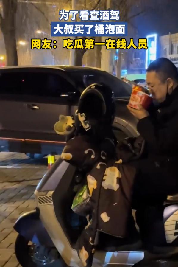 从来不缺看热闹的人!湖北宜昌,交警晚上在路边查酒驾,一位骑车的大叔看到后不但没有离开,反而在旁边的超市泡了一桶泡面,在旁边当起了“吃面群众”。网友:吃瓜群众秒变泡面大叔 视频中,大叔就坐在自己的电瓶车上面,夜晚户外的温度虽然不高,但大叔却毫不在意,一边吃着冒热气的泡面,一边等着看查酒驾的现场 不得不说,大叔的行为也是挺接地气的,发现有热闹,那就停下来看看。光看还不行,得给自己找个舒服的姿势,买桶泡面,有吃有喝,坐着慢慢看。这种随时随地把自己安顿好的本事和心态,其实也挺让人羡慕 仔细想想,大叔这个举动里藏着一层意思:他压根不担心自己会被查。骑的是电瓶车,不沾酒驾这回事儿,心里坦荡,所以才能这么从容 那些看到交警就心慌、掉头就跑的人,大概率心里有鬼。而大叔这种,看热闹看得理直气壮,反而说明他平时就是守规矩的人 不少网友看到这一幕,也没人觉得大叔多管闲事,反而都觉得亲切 有人说这就是街头特有的市井气息,也有人说换了自己也会停下来看两眼 其实大家笑过之后,心里都有数:查酒驾这种事,查得越严,路上就越安全。大叔坐那儿吃面看热闹,本质上也是在用他的方式表达一种支持,你查你的,我看我的,咱们各得其乐