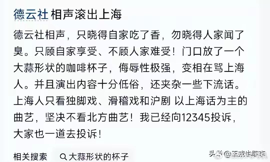 这一次被举报发生在刚刚开业没几天的上海德云社。而被举报的原因竟然是因为德云社门口的一个大蒜形状的咖啡杯子。这个理由还是第一次出现,甚是新奇。