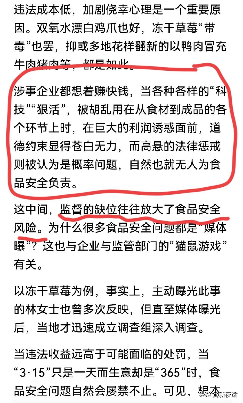 年年央视315晚会,年年食品问题触目惊心,却依旧循环往复,问题愈演愈烈。据新京报等媒体报道,川渝多家企业用工业双氧水漂白鸡爪,工人称“自己都不敢吃”;一向被视为健康零食的冻干草莓,被检出重金属超标14倍及20多种农药残留;网红“刘文祥麻辣烫”多款肉类以鸭肉冒充牛肉、猪肉。