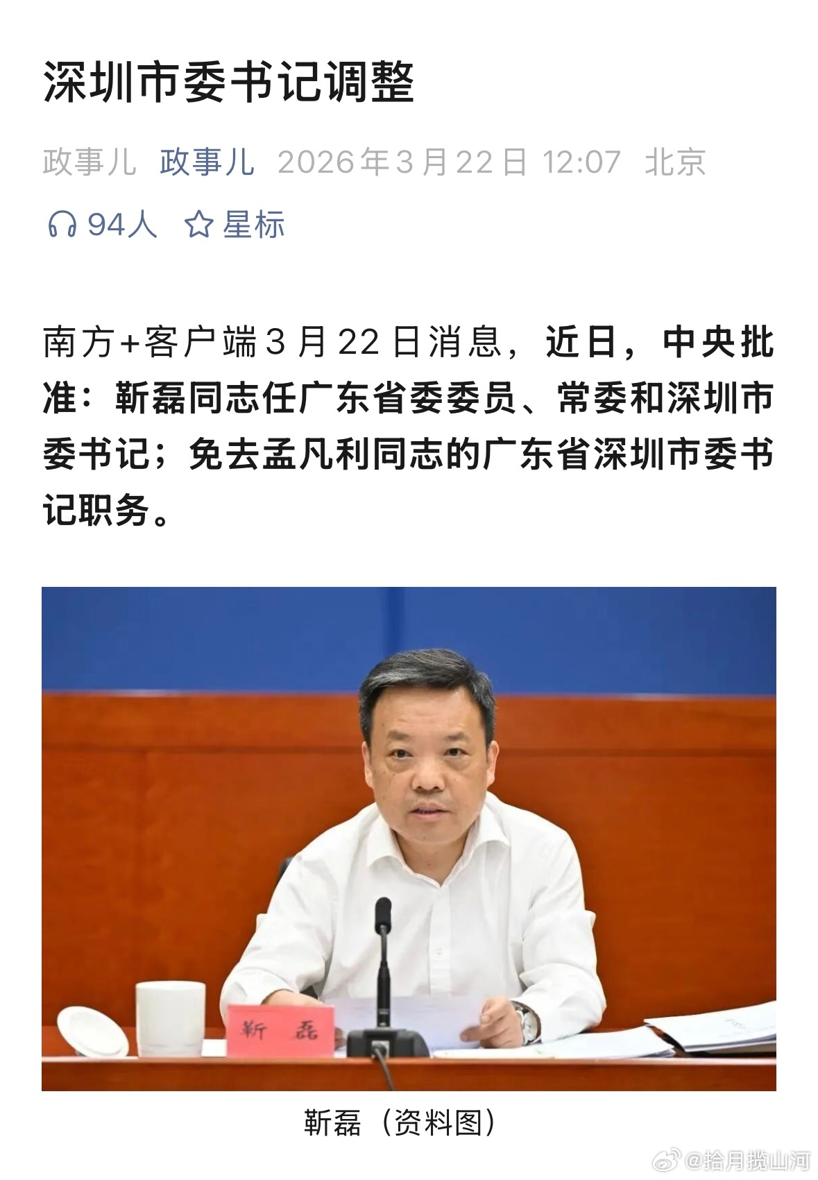 靳磊任深圳市委书记。