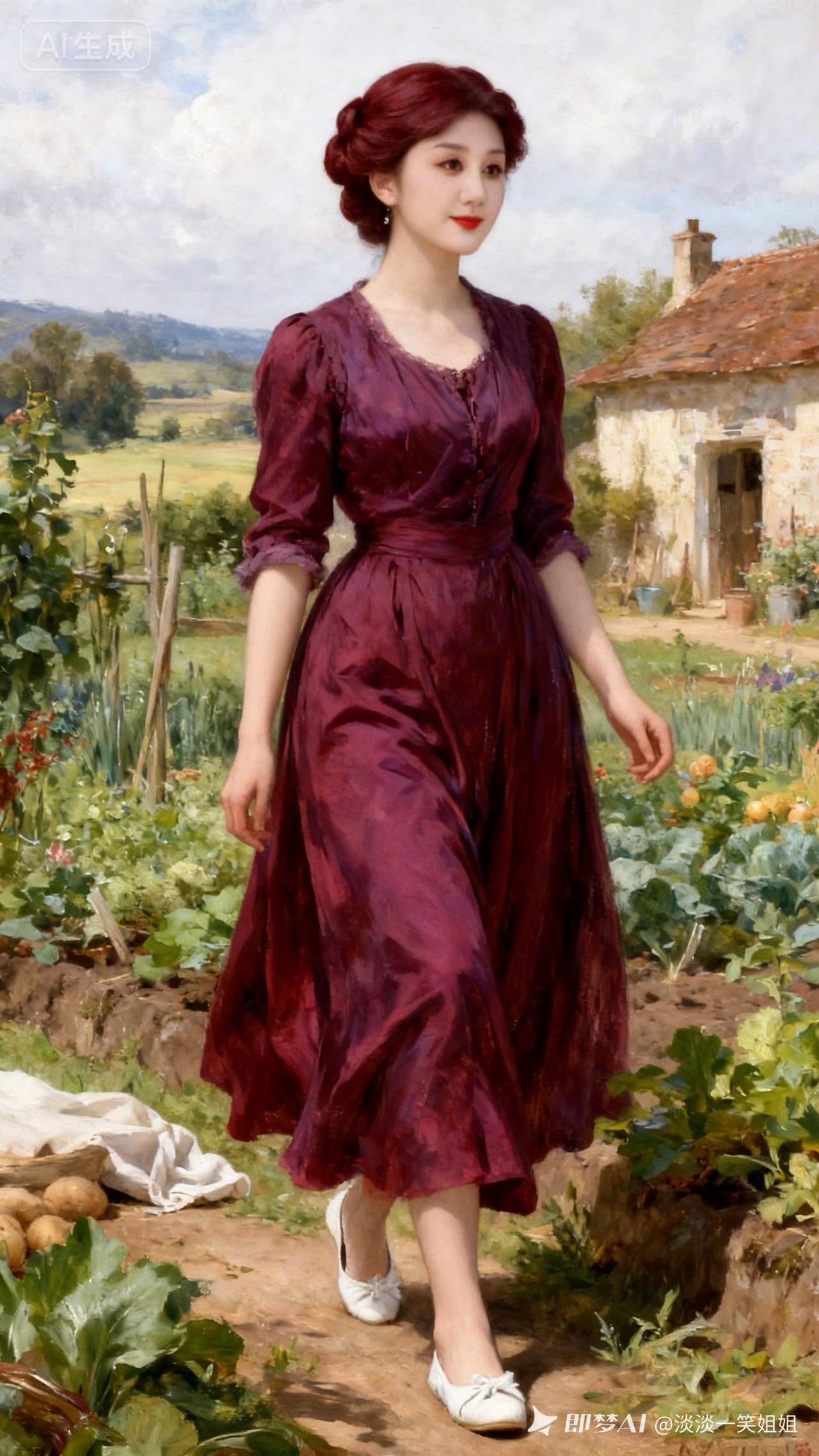复古红裙漫步田园,感受乡村的宁静与美好。