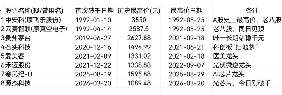 A股历史上有过8只千元股,说出来你可能不信,只有茅台是真·扛打!其他几只要么是早年股市刚起步,股票少被炒上去的,比如中安科、云赛智联,后来都跌下来了;要么是赶上风口,比如做扫地机的石头科技、搞医美的爱美客,风口过了股价就波动挺大。只有茅台,靠过硬的品牌和稳定的需求,稳稳站在千元以上,这商业模式是真没谁了~